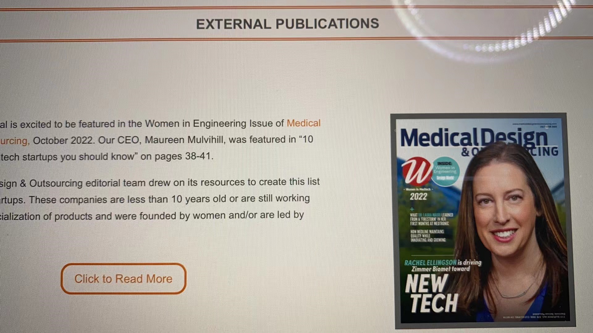 2022年10月的《医疗设计和外包的工程女性》杂志上,发布了对这家公司首席执行官莫琳·莫威希尔(Maureen Mulvihill)的报道,在第38-41页的“你应该知道的10家女性领导的医疗技术初创公司”中出现。