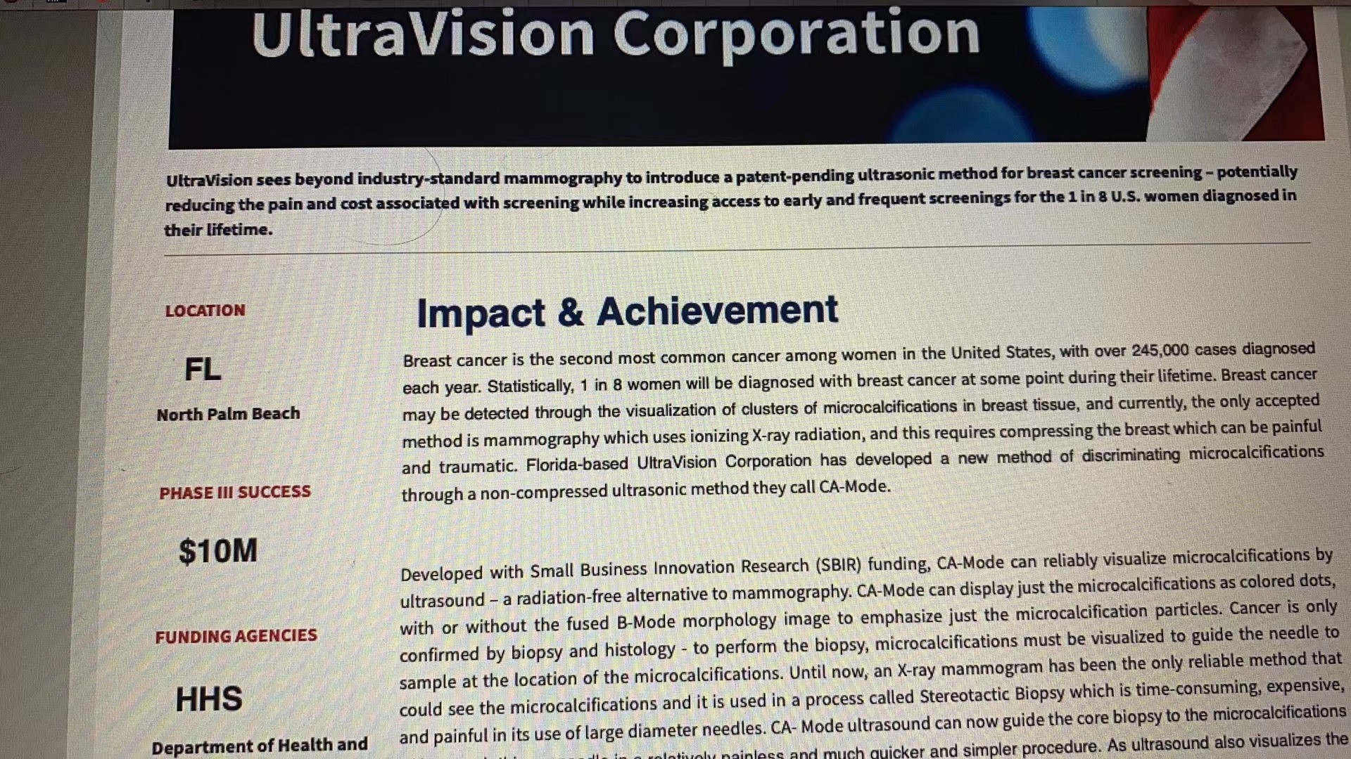 美国小企业管理局网于2021年9月8日发布SBIR/STTR-蒂贝茨奖得主——超视公司(UltraVision Corporation)在第三阶段获得成功的业绩和影响。超视公司在第一阶段和第二阶段的固定价格合同均系由联邦政府十一个携手机构之一美国卫生和人类服务部及其所属机构美国国立卫生研究院提供资助,而到了第三阶段,超视公司赢得了超过1000万美元的资金。超视公司超越了行业标准的乳房X光检查,引入了一种正在申请专利的超声波方法进行乳腺癌筛查——这可能会减少与筛查相关的疼痛和成本,同时增加八分之一的美国妇女一生中被诊断的早期和频繁筛查的机会。