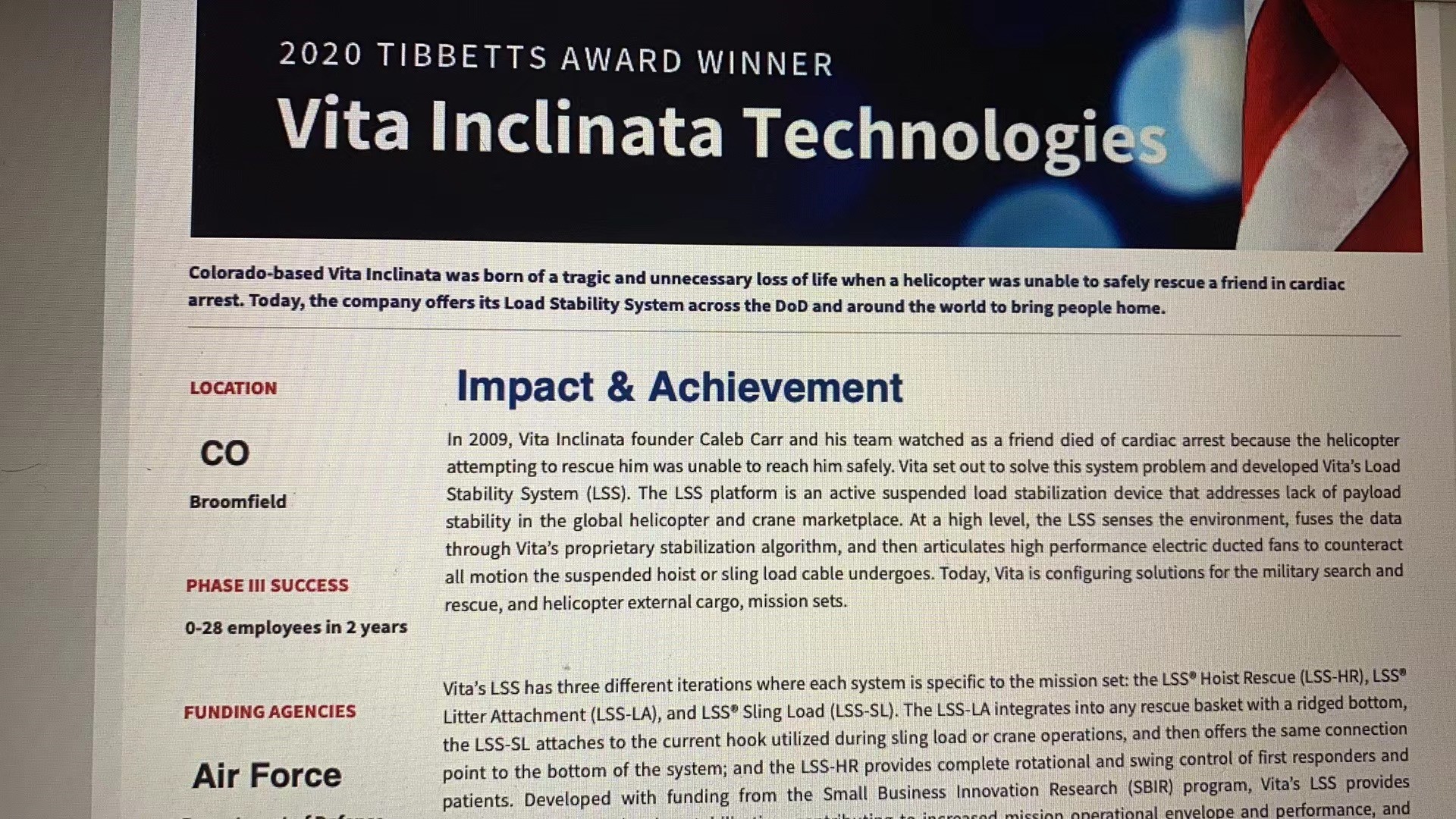 企业总部位于美国科罗拉多州的Vita Inclinata公司在其初创的第一和第二阶段由美国空军和美国特种作战司令部提供资助,而到了第三阶段获得巨大成功,估值超过1.5亿美元。这家小企业因直升机无法安全营救一名心脏骤停的朋友而遭受悲惨和不必要的生命损失。如今,该公司在国防部和世界各地提供负载稳定性系统,将人们带回家。