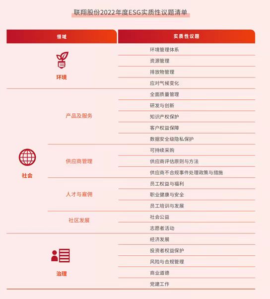 联翔股份的ESG报告显示,公司对标国内外行业经验及优秀实践,并根据应当遵循的国内、国际政策与标准,综合考量内外部利益相关方关注重点、同业对标分析,公司行业特点及战略方向,开展实质性议题分析。按照识别、评估和审议的程序,界定了具有较高实质性的议题,作为公司的行动及报告重点。由此,2022年,联翔股份筛选出4项环境提议,13项社会议题,5项治理议题。