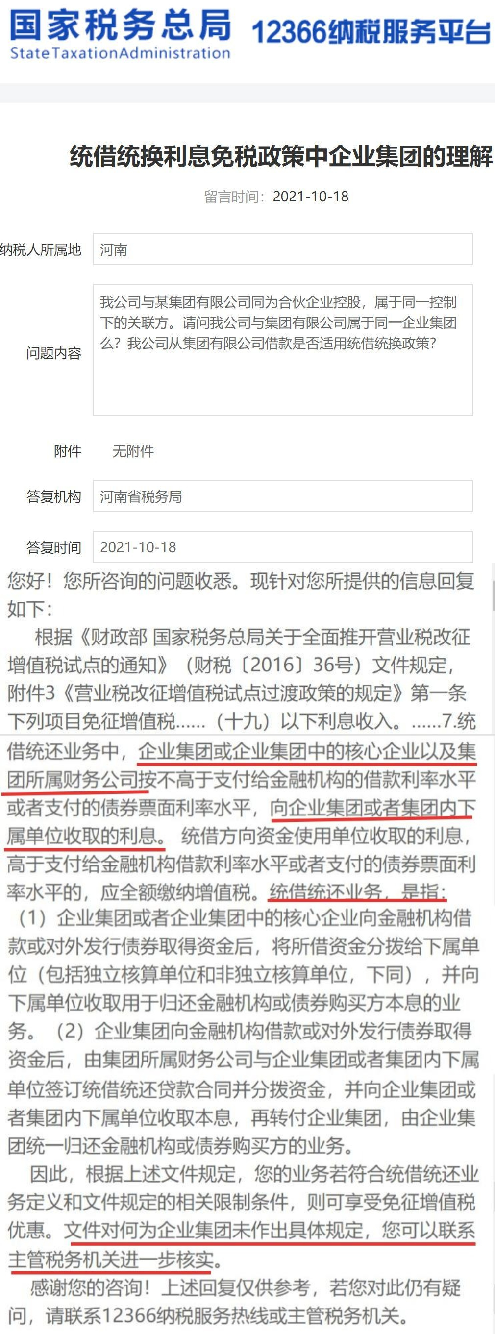 我们先学习河南省税务局对”统借统还利息免税政策中企业集团的理解“的答疑,然后我们再探讨法律法规中对企业集团的相关规定。