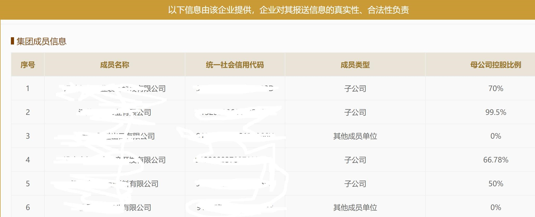 我们可以看下面一个集团公示的信息,它的母公司对其他成员单位的控股比例为0,这种为0的情况可能是间接持股的孙公司,也可能会是并不存在控股关系,但是存在实质性控制的公司。