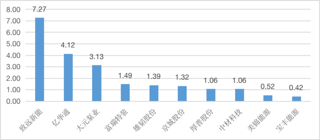 ——偿债能力有待凸显。2020年到2021年,亿华通流动比率从4.78下降到4.12,有小幅度下降,但远高于行业均值(1.36),说明企业现阶段短期偿债能力较强。其次,亿华通处于“氢能源”赛道前列(见图3),仅次于致远新能(7.27),且远高于美锦能源、宝丰能源等多家企业。可见,亿华通在偿债能力方面有较大优势。
