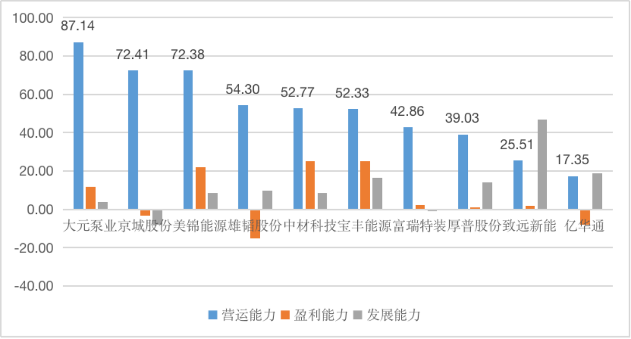 图4 “氢能源”赛道企业营运、盈利和发展能力表现(100分制)