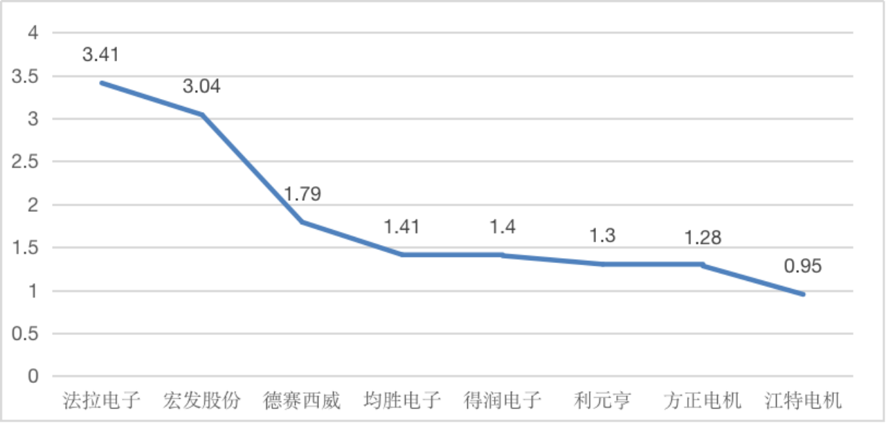 首先,2021年德赛西威流动性及偿债能力表现较弱(见图2),仅为1.79,该赛道内此指标最优的法拉电子、宏发股份分别是3.41和3.04,德赛西威仅属于该赛道内平均水平。其次,营运能力表现优秀(见图3),德赛西威排在首位,为27.85分;第三,盈利能力表现欠佳,以76.25分位居第四。8家样本企业盈利能力差异较大,法拉电子和江特电机高达80分,但均胜电子和得润电子盈利能力仅在30左右。第四,发展能力良好。2021年,以百分化总资产增长率衡量的发展能力为20.94,仅低于利元亨的29.23分,公司发展前景广阔。