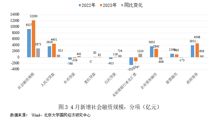 2023年4月,新增社会融资规模1.22万亿元,较去年同期多增2873亿元,低于市场预期。这主要源于人民币贷款新增额度较低,同比多增仅为815亿元,对社会融资规模的支撑力度减弱,若考虑到去年同期的低基数,4月实际信贷需求整体显偏弱,同时企业债券融资同比少增809亿元,成为本月社融的主要拖累项。但从社融多增的支撑力度来看,尽管未贴现银行承兑汇票在4月减少1347亿元,但实现了同比少减1210亿元,间接成为本月社融的主要支撑分项,外币贷款、信托贷款以及政府债券分别同比多增441亿元、734亿元、636亿元共同对社融构成支撑。