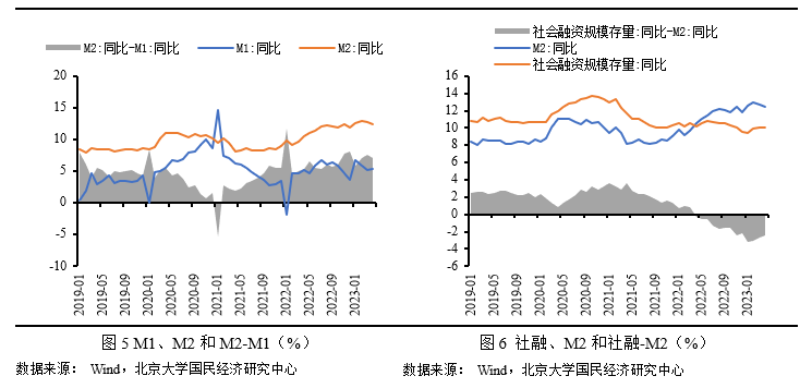 从社融与M2的同比增速差看,4月末两者的同比增速差为-2.4%,较上期继续减少0.3个百分点,增速差再次降低。自2022年4月以来社融扩张速度持续弱于货币扩张速度,且增速差持续为负,预示着资金流动性持续充裕。自今年以来,稳经济政策持续落地生效,尤其是第一季度政策发力显著,增速差持续减小,表明资金空转现象有持续缓解的趋势,预计未来仍将进一步缓解。