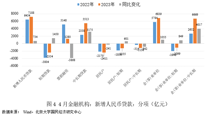 2023年4月,新增人民币贷款7188亿元,同比多增734亿元,符合以往的季节效应,但显著低于第一季度的信贷需求力度,同时也低于市场预期。