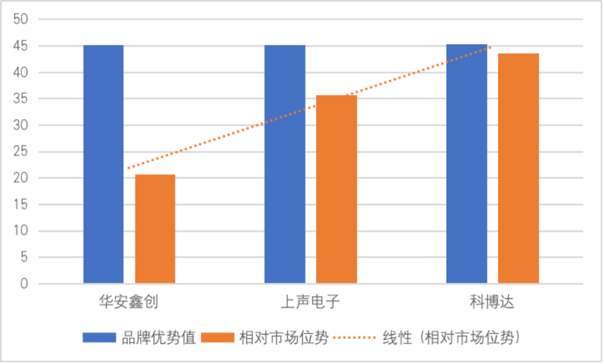 如图3所示,2021年智能座舱赛道企业华安鑫创、上声电子、科博达的品牌优势值分别为45.10、45.11、45.38。虽然上声电子排名第二,但三家企业品牌优势值之间差距不大,上声电子仍需着力提高盈利能力。2021年华安鑫创、上声电子、科博达的相对市场位势分别为20.69、35.65、43.59,上声电子同样位居赛道第二,应继续努力提高主营业务收入,提升市场位势。
