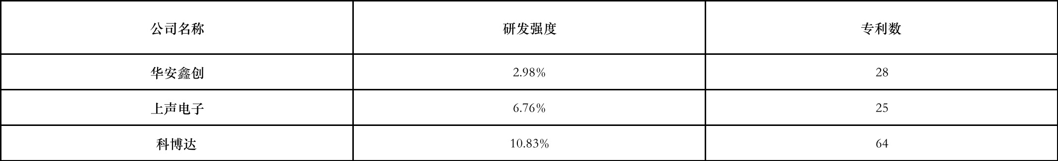 ——人才体系有待完善。2019-2021年,华安鑫创研发人员人数分别为660人、720人、844人。 2021年,华安鑫创、上声电子、科博达研究人员中,硕士生及以上人数占比分别为7.45%、3.81%、16.35%,可见在同赛道三家企业中华安鑫创研发人员的学历水平处于中间水平。