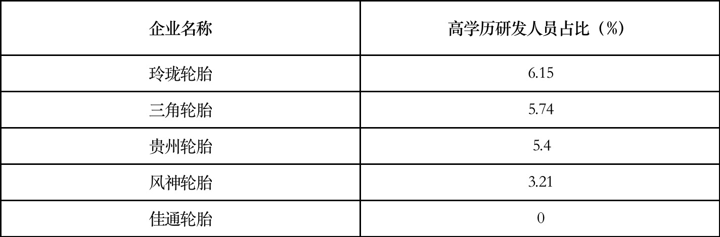 ——构建国际化、高层次人才体系。玲珑轮胎充分发挥人才第一资源作用,以梯队建设为重心,促进各项经营管理工作上下同欲、知行合一、步调一致。从2023年起每年选拔有潜质的优秀人才整合专业的培训资源开展能力提升培训班,建设一支思维视野、专业水准、能力素质等达到国际水平的人才队伍,为公司“7+5”战略实施提供有力支撑。截至2022年,玲珑轮胎的研发人员数量达到2244人,占公司总人数的比例为12.11%。其中博士研究生4人,硕士研究生134人,本科970人,专科及以下1136人。数据显示,在“轮胎”赛道中,玲珑轮胎的高层次研发人员占全体研发人员的比重最高,为6.15%(见表2),说明玲珑轮胎重视对于高层次人才的吸纳与培养,拥有高质量的人才后备军。