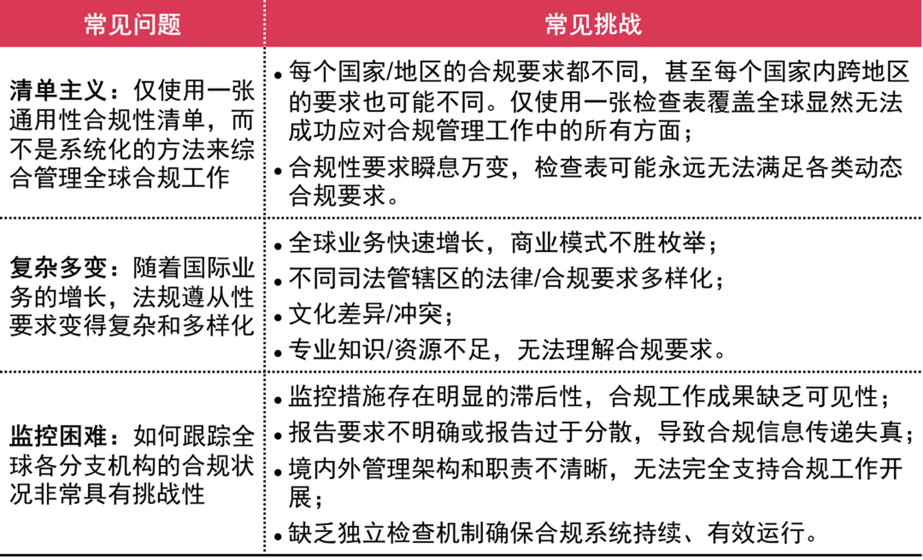 - 运营阶段:难以有效分配不同国家地区的合规管理资源,以应对不同国家迥异的法规政策要求,实现常态化的合规管理机制是很多境外经营公司面临的挑战;