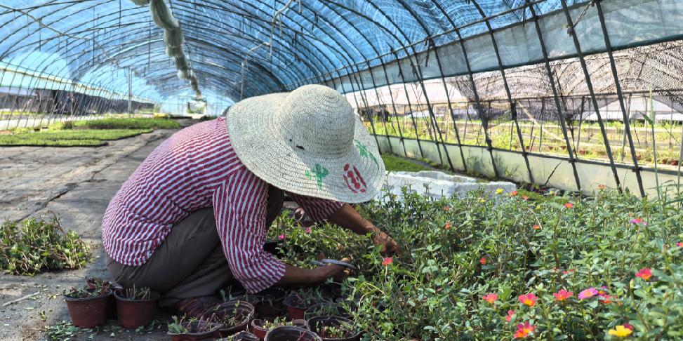 8月三伏天中的一天清晨,位于嘉兴市嘉善县姚庄镇的花千语花草花境批发基地内,花农正忙着扦插太阳花,一个月长成后作为商品售卖。