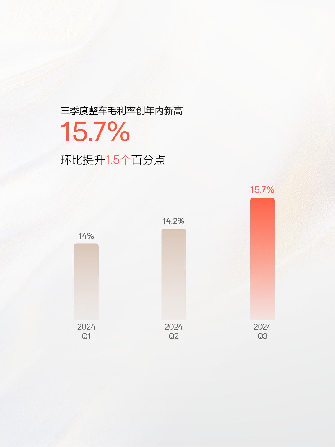 根据极氪(ZK.US)11月14日发布的2024年三季度财报,当季极氪整车营业收入创新高达144亿元,同比增长54.4%;整车毛利率达到15.7%,亦创下新高;前三季度,极氪总营收同比增长超50%至531亿元,已超2023全年业绩水平;极氪首次实现香港会计准则下单季度盈亏平衡。