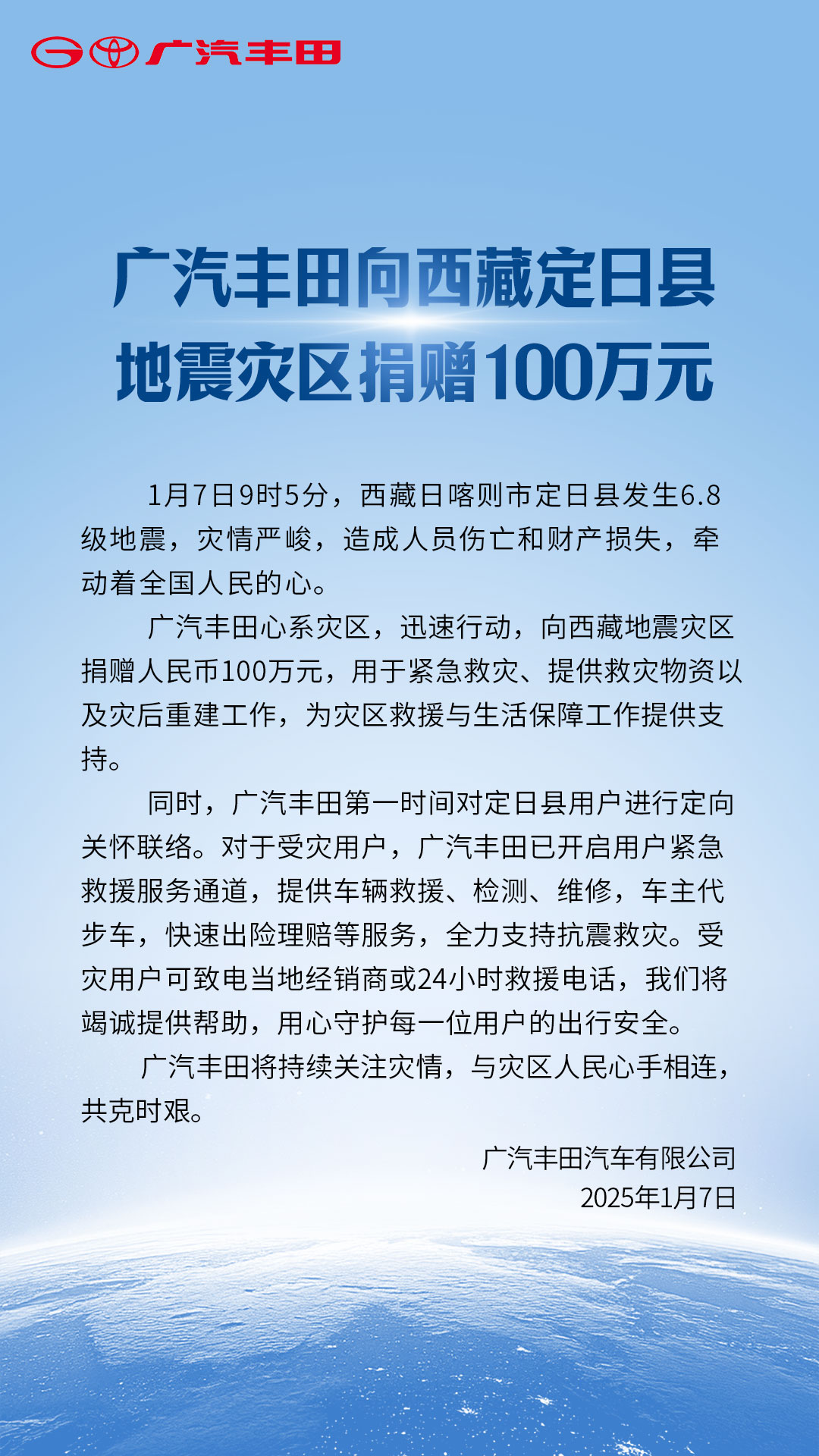 经济观察网讯 2025年1月7日9时5分,西藏日喀则市定日县发生6.8级地震,灾情严峻,造成人员伤亡和财产损失,牵动着全国人民的心。广汽丰田心系灾区,迅速行动,向西藏地震灾区捐赠人民币100万元,用于紧急救灾、提供救灾物资以及灾后重建工作。