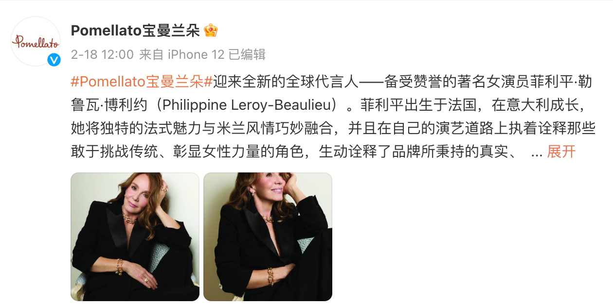 近日,意大利高级珠宝品牌宝曼兰朵官宣菲利平·勒鲁瓦·博利约(Philippine Leroy-Beaulieu)为新晋全球代言人。