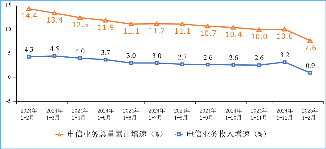 电信业务收入小幅增长。前2个月,电信业务收入累计完成2950亿元,同比增长0.9%。按照上年不变价计算的电信业务总量同比增长7.6%。