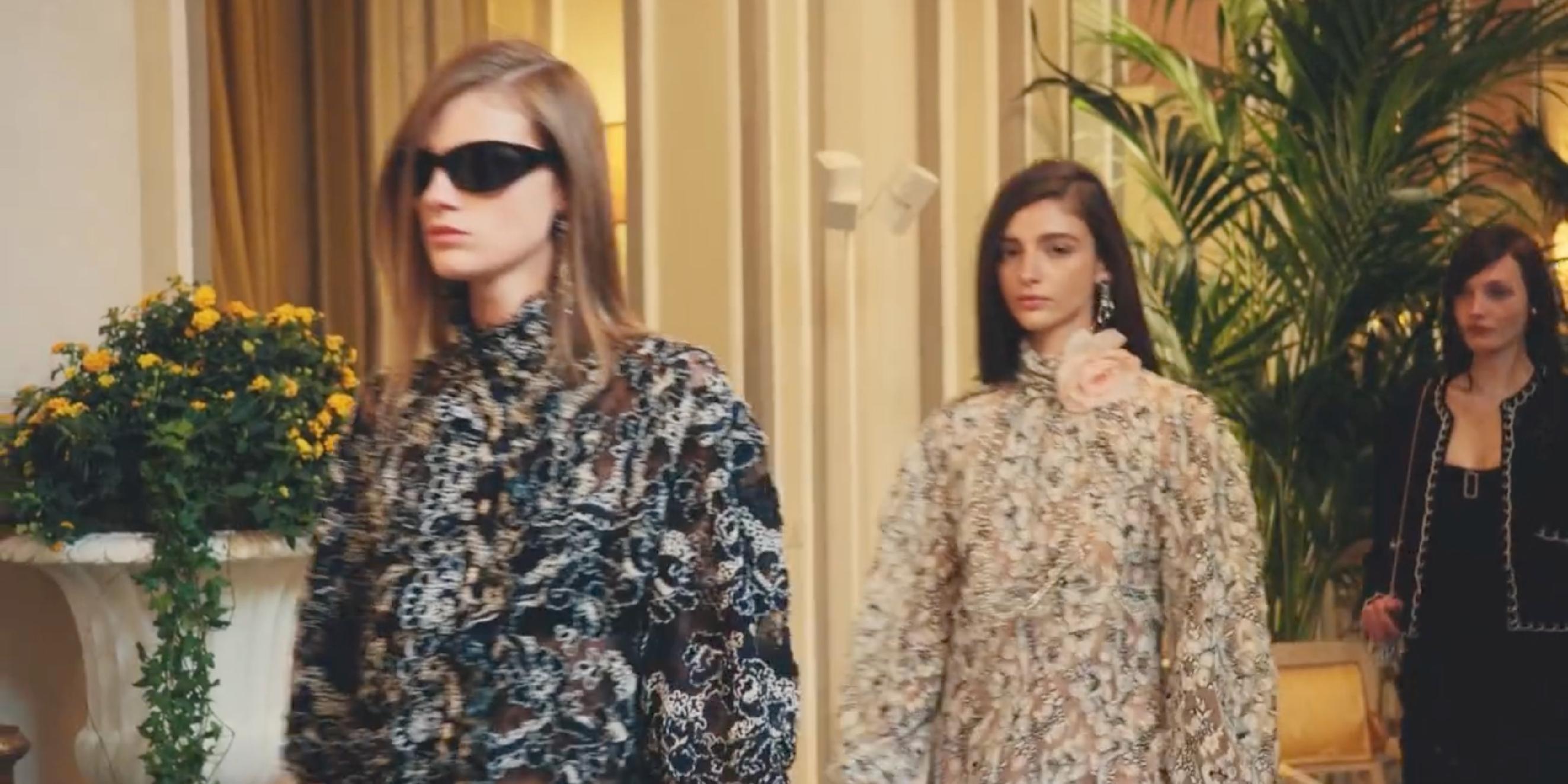 新系列从埃斯特别墅的建筑与花园中汲取灵感,色调呼应陶土外墙的哑光金、紫藤的淡紫色及九重葛的亮粉色。日装主打轻盈混搭风格:哑光金色泡泡纱睡衣套装以微光提亮慵懒感,亮片装饰的淡紫色粗花呢套装搭配飘逸衬衫,延续品牌标志性元素的同时注入年轻活力。压轴黑色塔夫绸晚礼服则以戏剧性廓形收尾,凸显高定工坊对奢华面料的驾驭力。