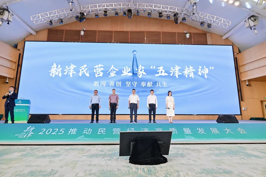 此次现场还发布了“敢闯、善创、坚守、奉献、共生”的新津民营企业家“五津”精神。以新希望刘永好、志辉医院余娟、事丰医疗石保社、济通智能装备伍大成、达威科技严建林为代表的五位民营企业家,结合企业发展经历和自身成长阐述了“五津”精神的生动实践和丰富内涵。