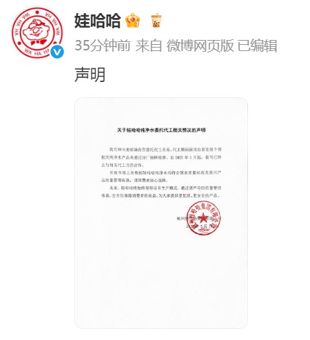 经济观察网讯 近日,有网友在社交平台发文称,自己购买的娃哈哈纯净水,瓶身标注生产商为今麦郎,引发热议。5月15日,娃哈哈集团官方微博发布声明称,公司和今麦郎确存在委托代工关系,代工期间公司自查发现个别批次纯净水产品未通过出厂抽样检测。自2025年4月起,公司已终止与相关代工方的合作。