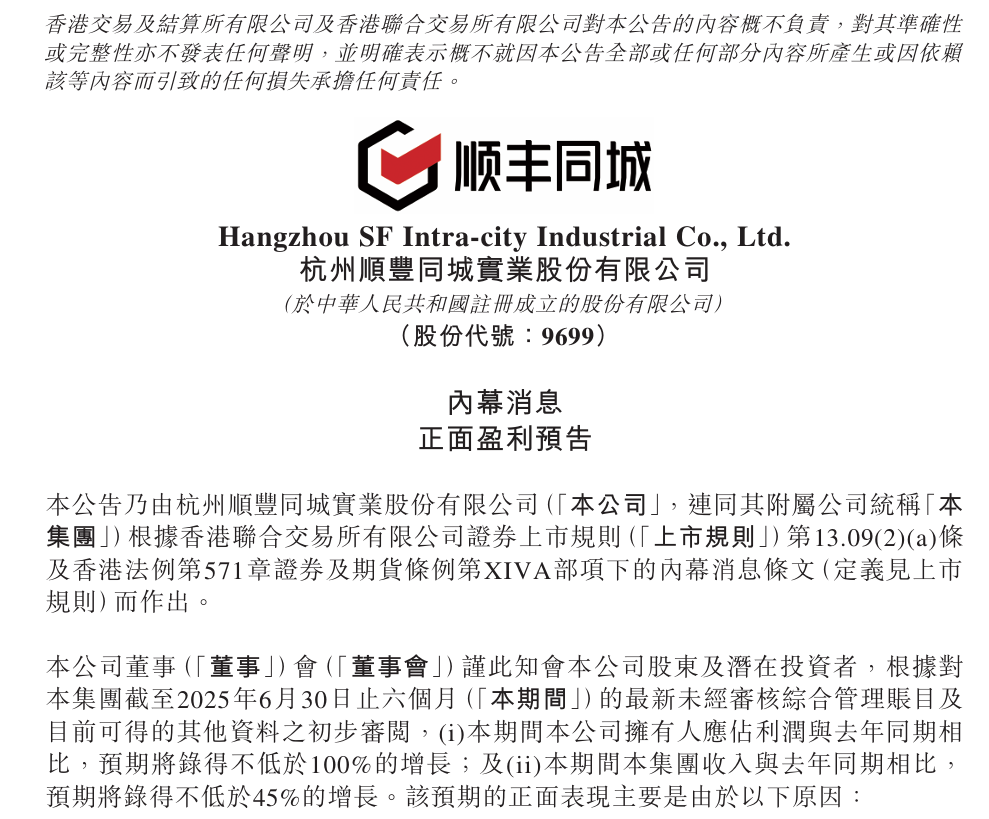 8月20日,顺丰同城发布公告,预计截至2025年6月30日的六个月内,公司拥有者应占利润将同比增长不低于100%,而集团收入预计将同比增长不低于45%。该正面盈利预告主要归因于即时配送行业的快速发展和需求增加,以及公司各项业务的均衡高质量发展,带动了订单量和收入的健康增长。