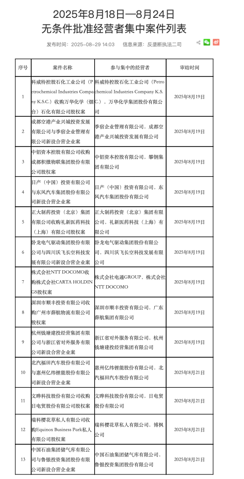 经济观察网 据市场监管总局网站8月29日消息,市场监管总局发布2025年8月18日—8月24日无条件批准经营者集中案件列表,其中包括科威特控股石化工业公司(Petrochemical Industries Company K.S.C.)收购万华化学(烟台)石化有限公司股权案、日产(中国)投资有限公司与东风汽车集团股份有限公司新设合营企业案等。