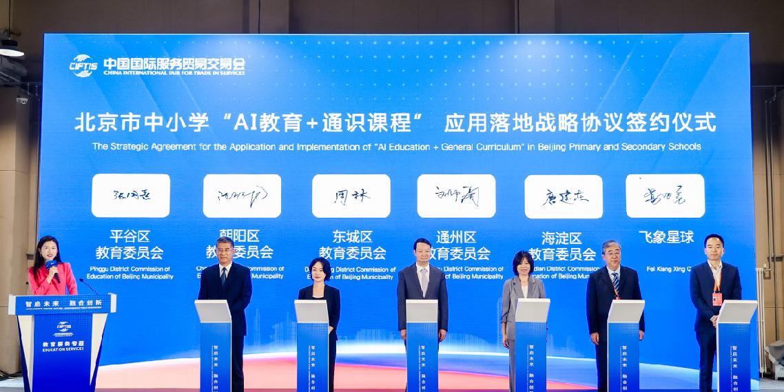 9月11日,2025年中国国际服务贸易交易会(下称“服贸会”)教育服务专题开幕式上,北京海淀区教委、东城区教委、朝阳区教委、平谷区教委、通州区教委与飞象星球共同签署《北京市中小学“AI教育+通识课程”应用落地战略协议》,推动“AI教育+通识课程”从政策指导转化为课堂实践,培养学生数字素养与AI创新思维。