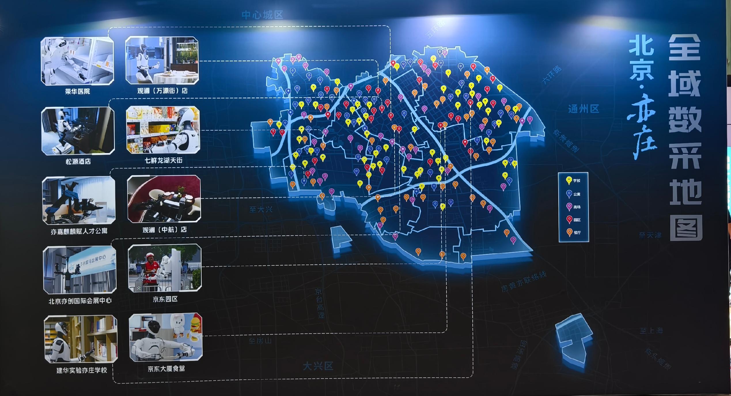 2025年8月,在北京世界机器人大会的展区里有一张“具身智能数据采集地图”,地图上有近百个真实采集点位,分布在药房、图书馆、酒店、物流园区等公共与商业空间,构成了一张动态运转的人机协同网络。