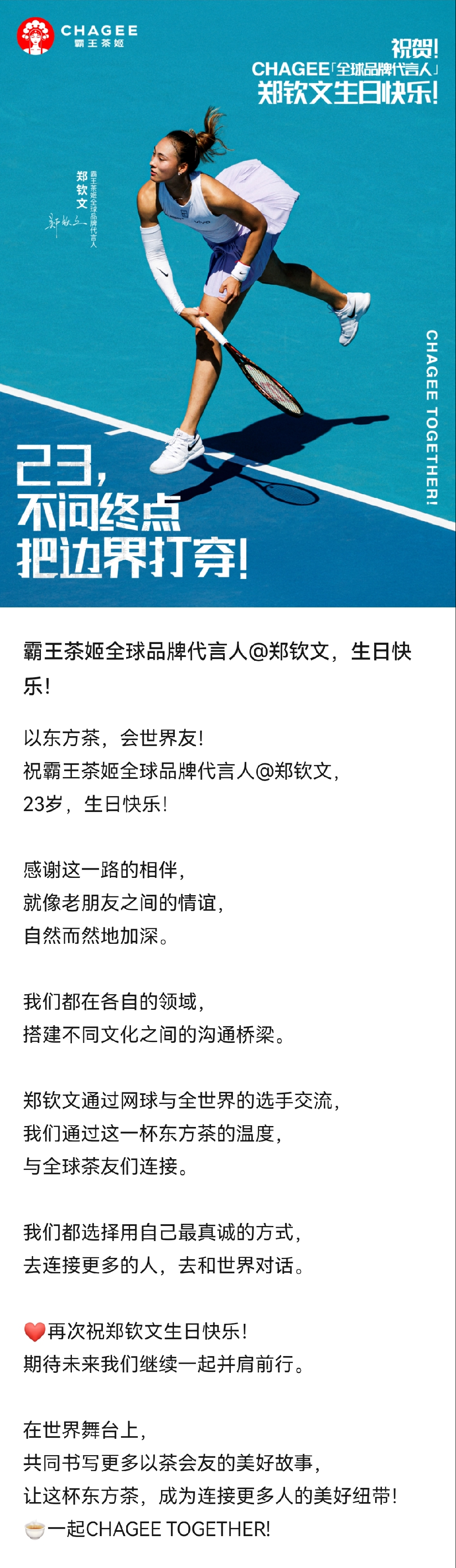 霸王茶姬与郑钦文的合作并非 “突击押注”。早在 2024 年,郑钦文就以 “健康大使” 身份加入品牌阵营,双方通过生日互动、赛事节点赠饮等活动,持续强化粉丝联结与品牌认知。这种长期培育,让 “郑钦文 = 霸王茶姬健康形象” 的认知深入人心,为此次升级打下坚实基础。