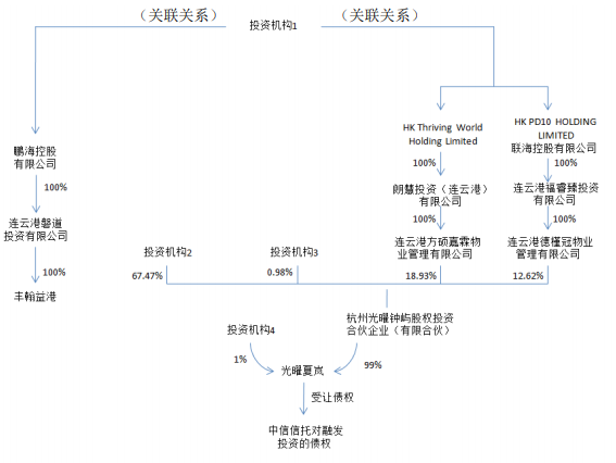 实际上,对于光曜夏岚的介绍,皇庭国际在最早的公告中亦曾称它和丰翰益港是“受同一控股股东控制”,其后修正为“两者并不构成同一控股股东控制,但存在关联关系”。具体的关联情形,如图表1所示,丰翰益港为参与潜在债务重组的投资机构1关联的投资主体,而方硕嘉霖和德槿冠与投资机构1亦存在关联关系,因此光曜夏岚与丰翰益港均为投资机构1的关联公司。(注:皇庭国际以“后续开展具体合作还涉及保密需要”等理由,并未披露投资机构1的名称。)