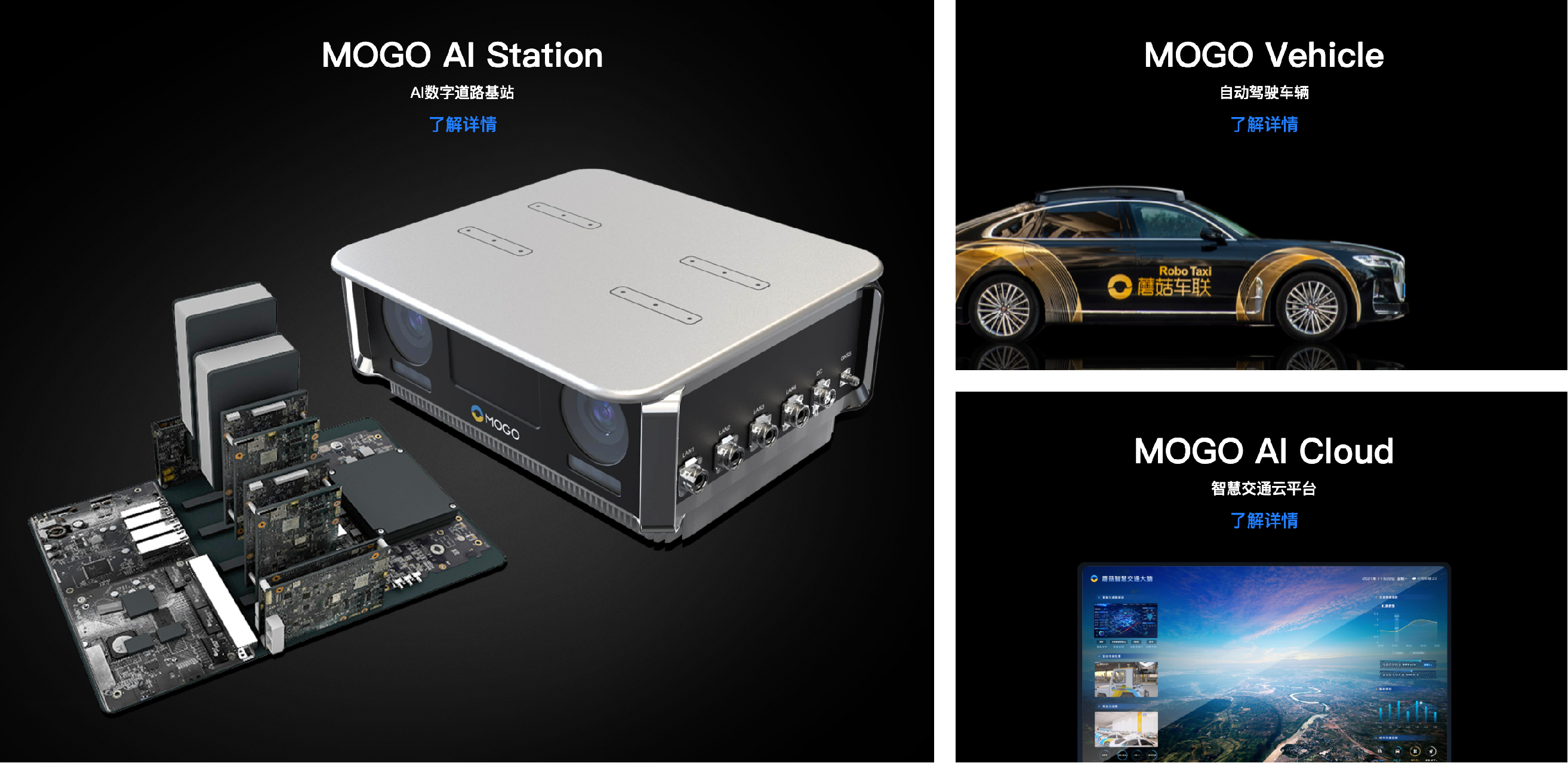 付强的新工作,则位于另一个截然不同的坐标。蘑菇车联成立于2017年,定位为“车路云一体化自动驾驶全栈技术与运营服务提供商”,官方网站展示的三大核心产品包分别是MOGO AI Station(AI数字道路基站)、MOGO Vehicle(自动驾驶车辆)和MOGO AI Cloud(智慧交通云平台)。