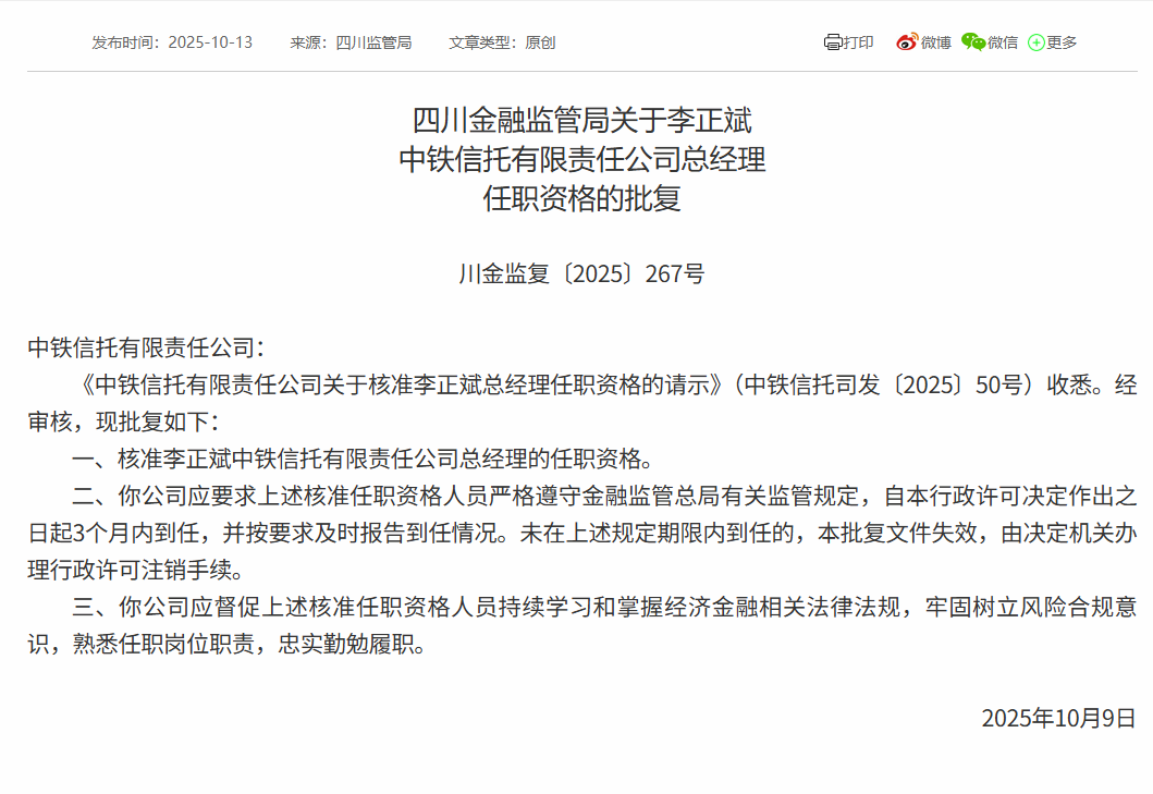 10月13日,四川金融监管局公布相关批复,核准李正斌中铁信托有限责任公司总经理的任职资格。以下是相关批复正文: