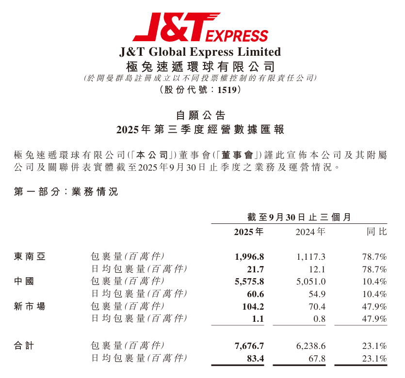 10月14日,极兔速递发布2025年第三季度经营数据汇报,报告显示,截至2025年9月30日止之第三季度,公司总体实现包裹量约76.8亿件,同比增长23.1%;日均包裹量8340万件。