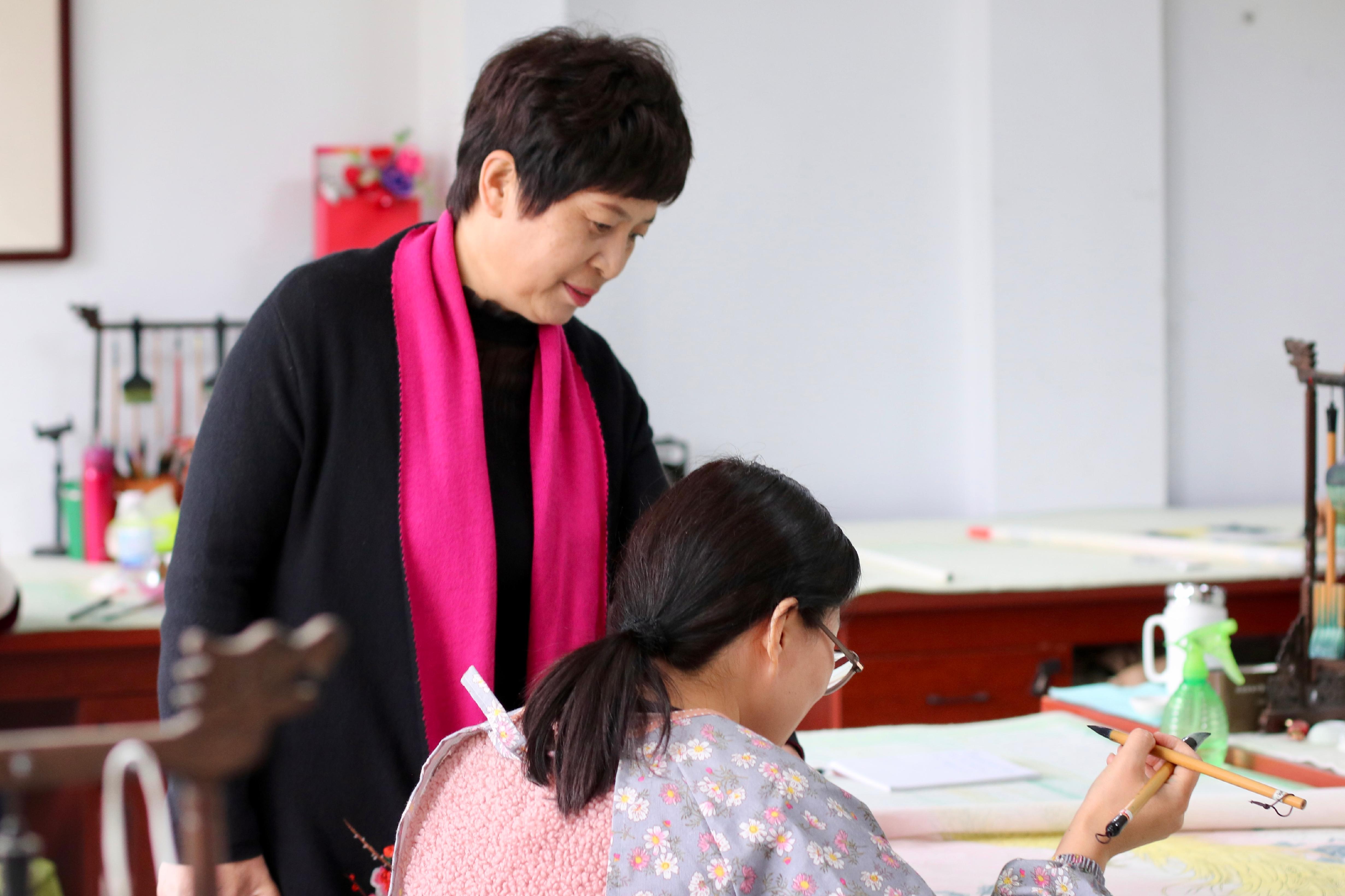 徐嫚嫚18岁时跟随徐凤秋学习工笔画,现在是鲁西书画院培训部负责人。从少年时加入鲁西书画院,到现在已是两个孩子的母亲,徐嫚嫚作为较早跟随徐凤秋学习的学员之一,她经历了书画院从最开始的三排平房,到现在一幢三层综合楼的发展。