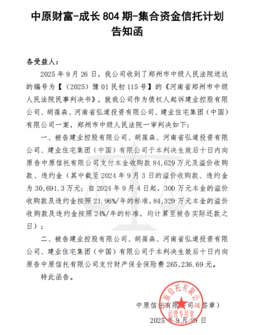 2025年9月29日,中原信托向“中原财富-成长804期”受益人披露一则重要消息,郑州市中级人民法院一审判决: