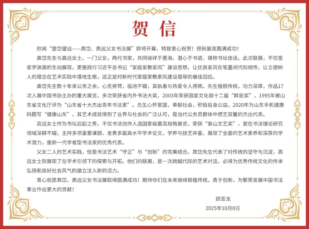 作为“崔子范诞辰110周年主题年”的重要单元,本次联展集中展出了高岱、高远两位书法家近年来书法创作的精品力作。两位创作者深耕书法领域多年,造诣深厚:作品既延续传统书法的笔墨精髓,又融入当代审美的创新意趣;而“父女联展”的呈现形式,更成为传承家风笔韵、彰显桑梓深情的生动缩影。此次二人载誉归乡,以“登岱望远”为主题用笔墨诉说离乡岁月里从未褪色的乡愁,为家乡人民带来跨越山海的赤子之礼。这次展览既是两位老师是对故土哺育的深情回望,也是对桑梓父老的真诚回馈,他们以笔为桥,将个人艺术追求与家乡文化脉络紧紧相连,呈献了一场高水准书法盛宴,让观众在笔墨的刚柔相济中,感受古胶文风的温润绵长。