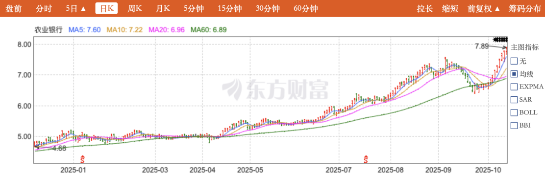 自今年9月25日以来,农行股价已连续13个交易日收涨,不断刷新历史新高,累计涨幅超 20%,远超同期大盘表现。拉长时间维度,今年以来,农行股价涨幅已达54.51%,大幅领先工行(15.58%)、建行(10.73%)、中行(2.28%)等同行,成为国有银行中的“领涨者”。