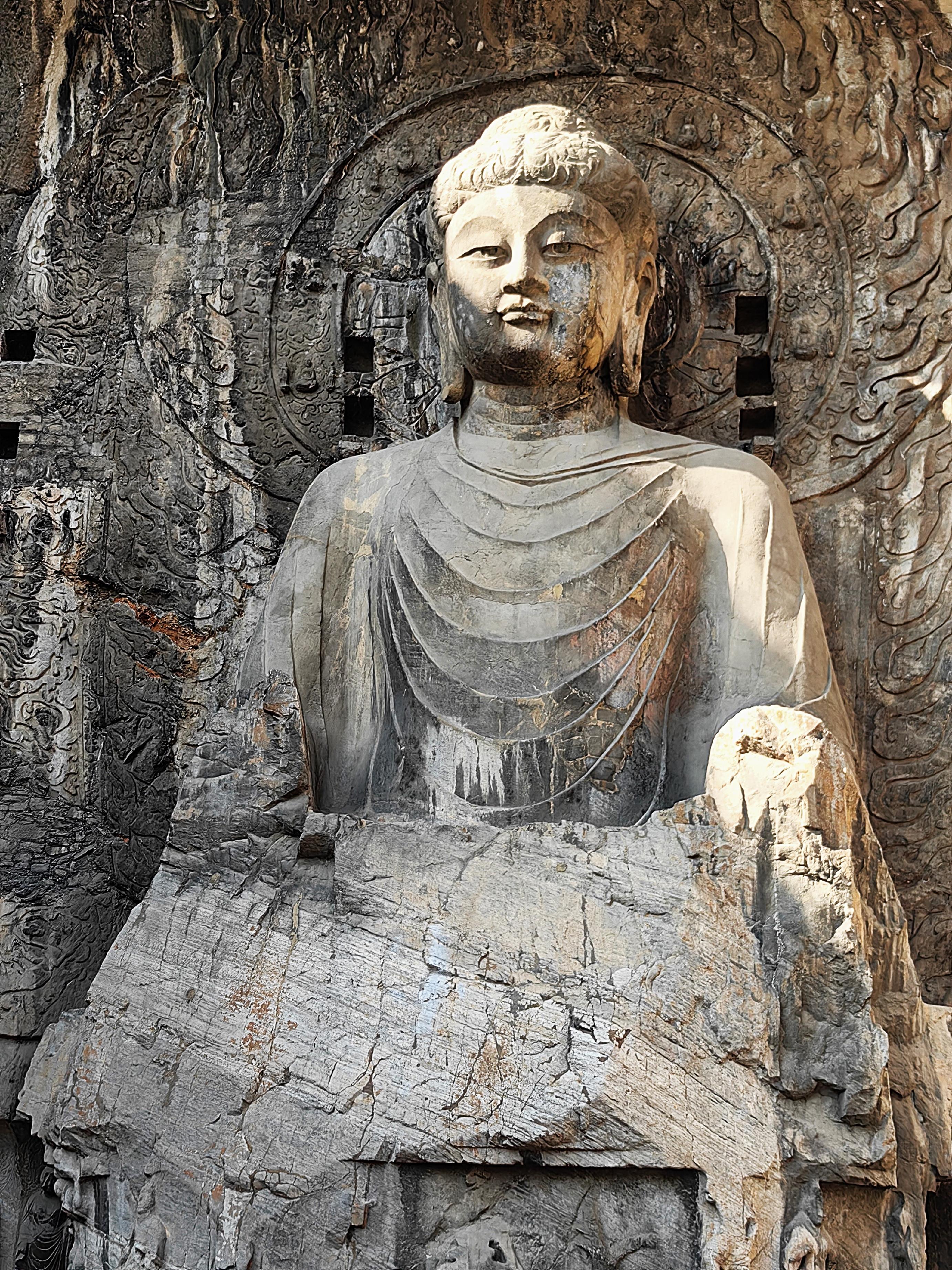 奉先寺是龙门石窟规模最大、艺术最精湛的一组摩崖型群雕。主尊卢舍那大佛通高17.14米、头高4米、耳朵长达1.9米,以神秘的微笑著称,被誉为“东方的蒙娜丽莎”、“世界最美雕像”。卢舍那,意为光明遍照。《大卢舍那佛龛记》有“实赖我皇,图兹丽质”的记载,这尊卢舍那佛的形象是仿武则天的形象雕刻的。