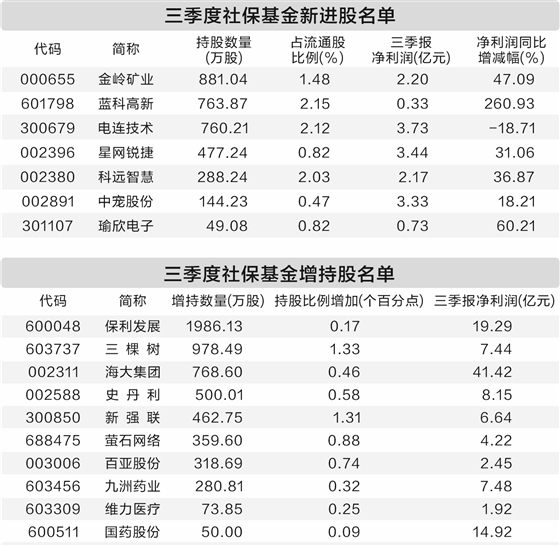 经济观察网 据证券时报网消息, 随着上市公司三季报陆续披露,社保基金第三季度的持仓动向逐渐浮出水面。据证券时报·数据宝统计,社保基金三季度末出现在33只个股前十大流通股东名单中,合计持股量为6.25亿股,期末持股市值合计130.70亿元。从持股变动来看,社保基金对6股持仓不变,新进7股,增持10股,减持10股。