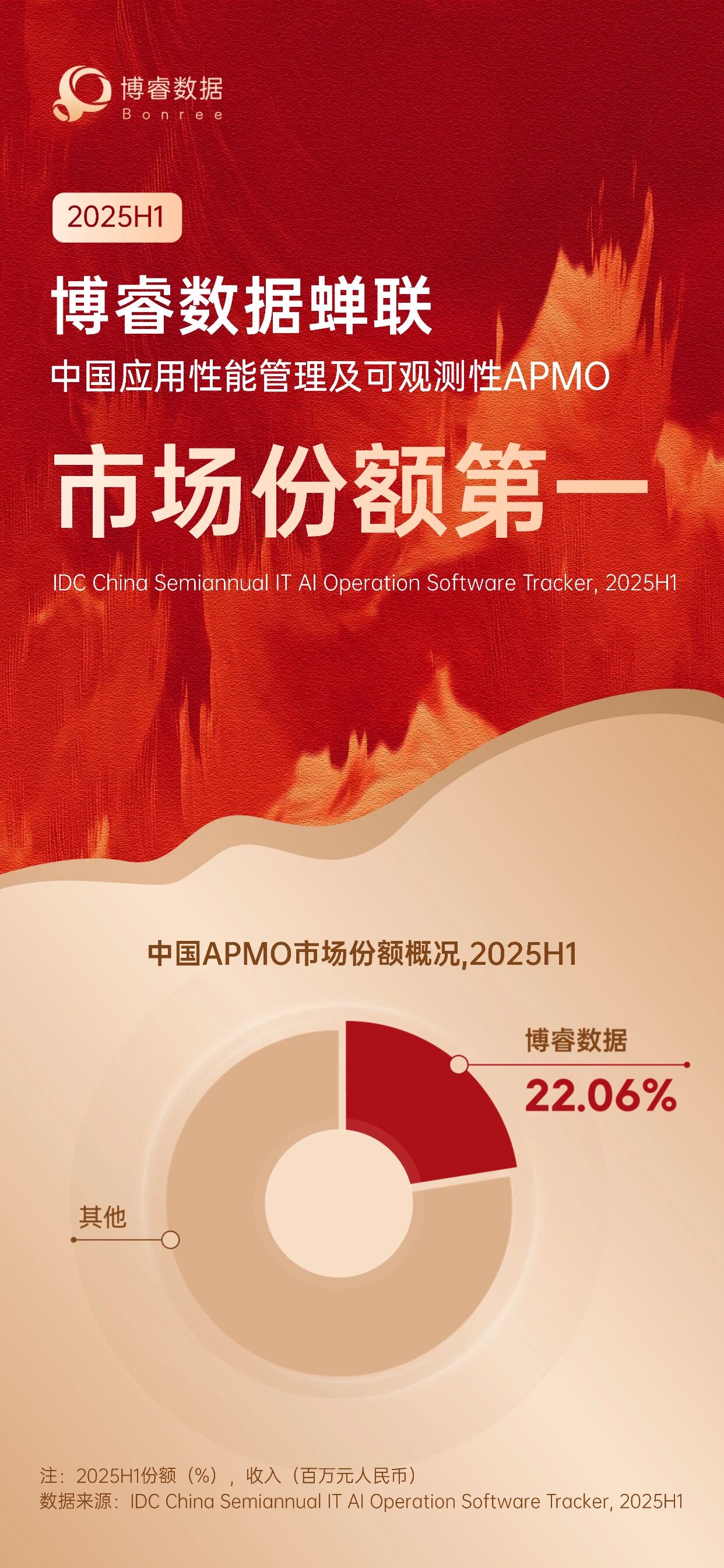 根据国际权威咨询机构IDC最新发布的《中国IT智能运维软件产品市场跟踪报告,2025H1》,博睿数据(股票代码:688229)在中国应用性能监控及可观测性(APMO)市场份额占比持续领先,以22.06%的市场占有率稳居第一。这标志着博睿数据作为国内智能可观测性领域的领军企业,再次以实力证明其在中国市场的领导地位。