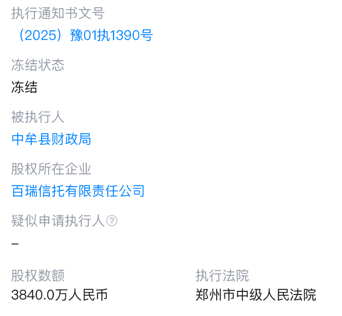 据了解,中牟县财政局作为百瑞信托的小股东,持有其3840万股,持股比例为0.96%。此次股权冻结,正是基于其所持有的这部分股权。