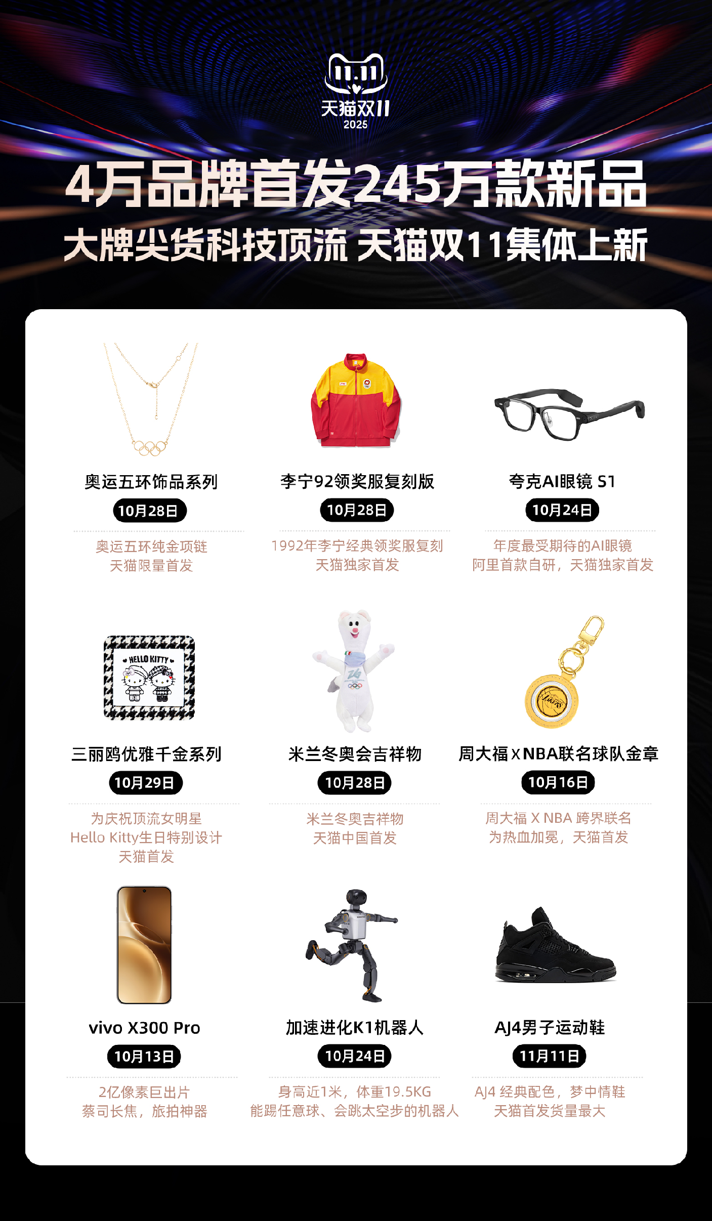 正值2026年米兰冬奥会倒计时100天之际,冬奥冠军王濛、奥运冠军吴敏霞共同登台,分别发布了米兰冬奥会吉祥物特许商品和全球首款奥运五环标志系列首饰,相关特许商品均在天猫双11独家首发上线。天猫总裁家洛介绍,“未来,天猫将持续以AI+平台优势,让奥林匹克这一超级百年品牌与中国消费者之间建立密切的纽带,让亿万粉丝共享体育盛事的激情与荣光。”