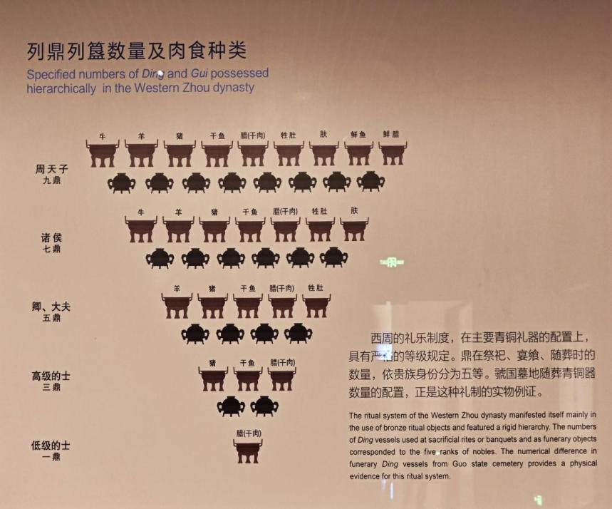 在礼器的规格违制上,春秋战国时表现最明显的是鼎的乱用。鼎不仅是烹煮食物的器具,更是重要的祭祀礼器。周礼规定:天子九鼎,诸侯七鼎,大夫五鼎,士三鼎或一鼎,到了东周则是天子、诸侯九鼎,卿七鼎,大夫五鼎,士三鼎或一鼎,在很多东周贵族的墓葬里都出现了规格超出的情况。春秋时楚庄王问周王使者“鼎之大小轻重焉”,战国秦国直接出兵东周索要九鼎。