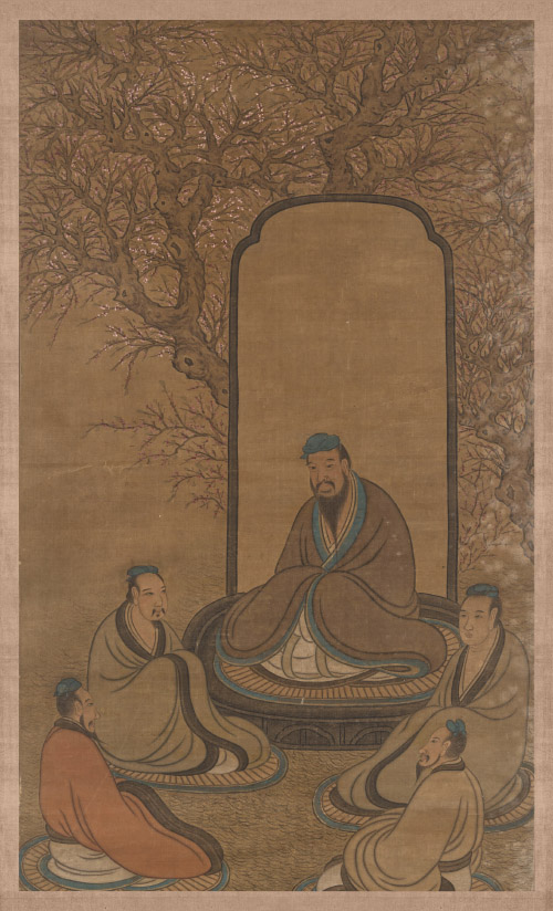 杏树旁有一土堆垒筑的小坛,我抬头一看,只见一约莫三十岁的男子正在宣讲些什么,这男子身上佩玉,身材高大匀称,挺拔端庄,看起来孔武有力又不失君子风度,想必他就是孔子。孔子周围有一群青年,有的衣着较精致、有的衣着较朴素,悉数认真听他讲话。