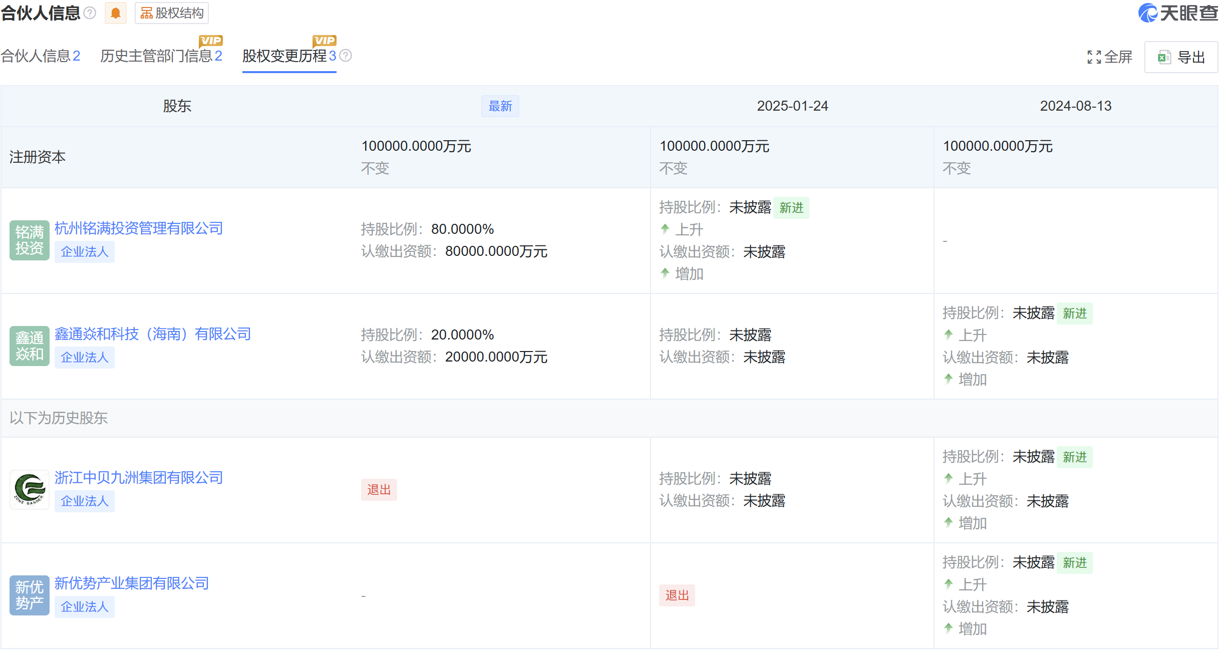 2025年1月,就在新优势国际收购西南合成,“入主”北大医药之际,中贝九洲退出了新优势国际。天眼查数据数据显示,1月24日,由徐晰人控制的杭州铭满投资管理有限公司成为新优势国际的新股东,而中贝九洲不再持股。