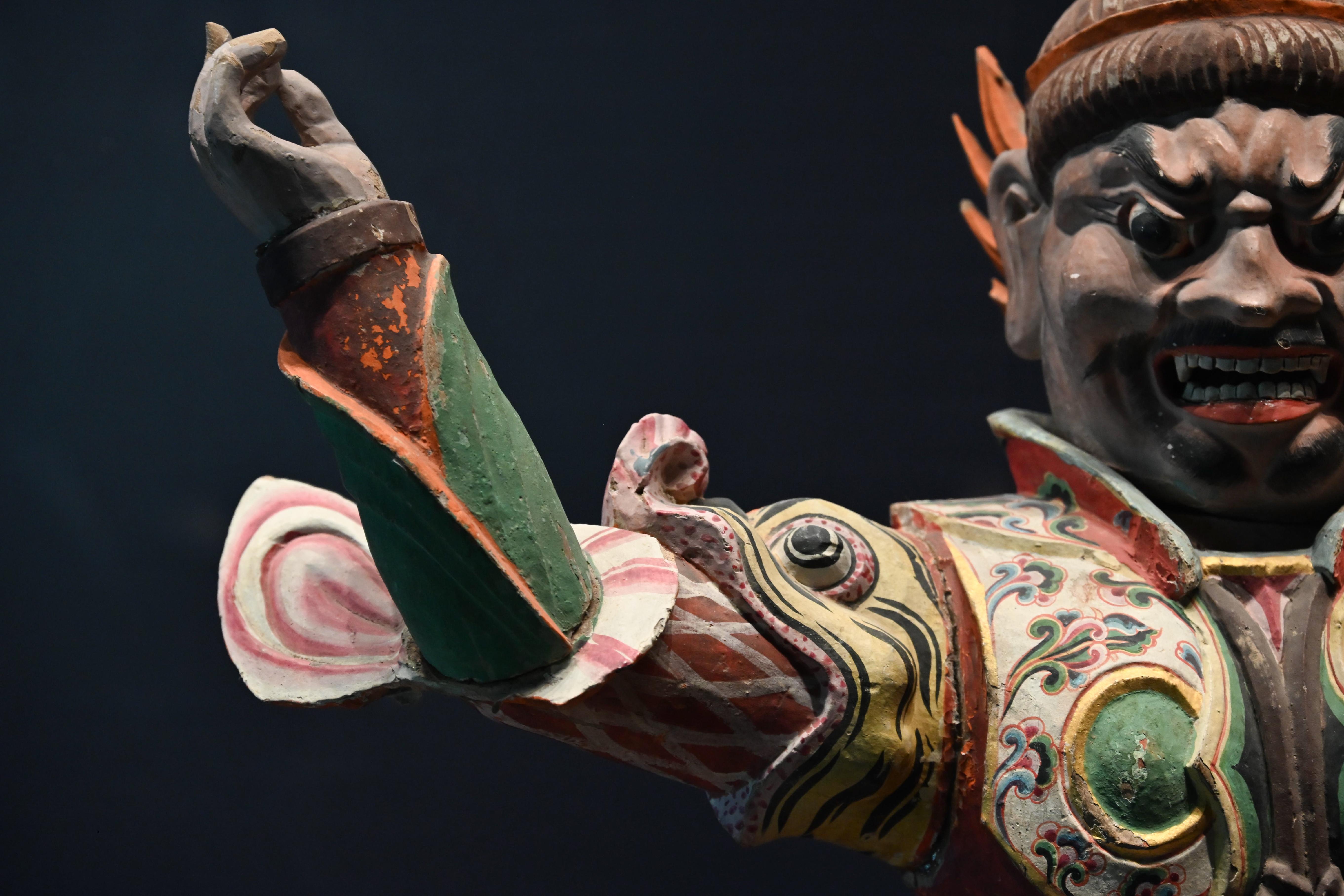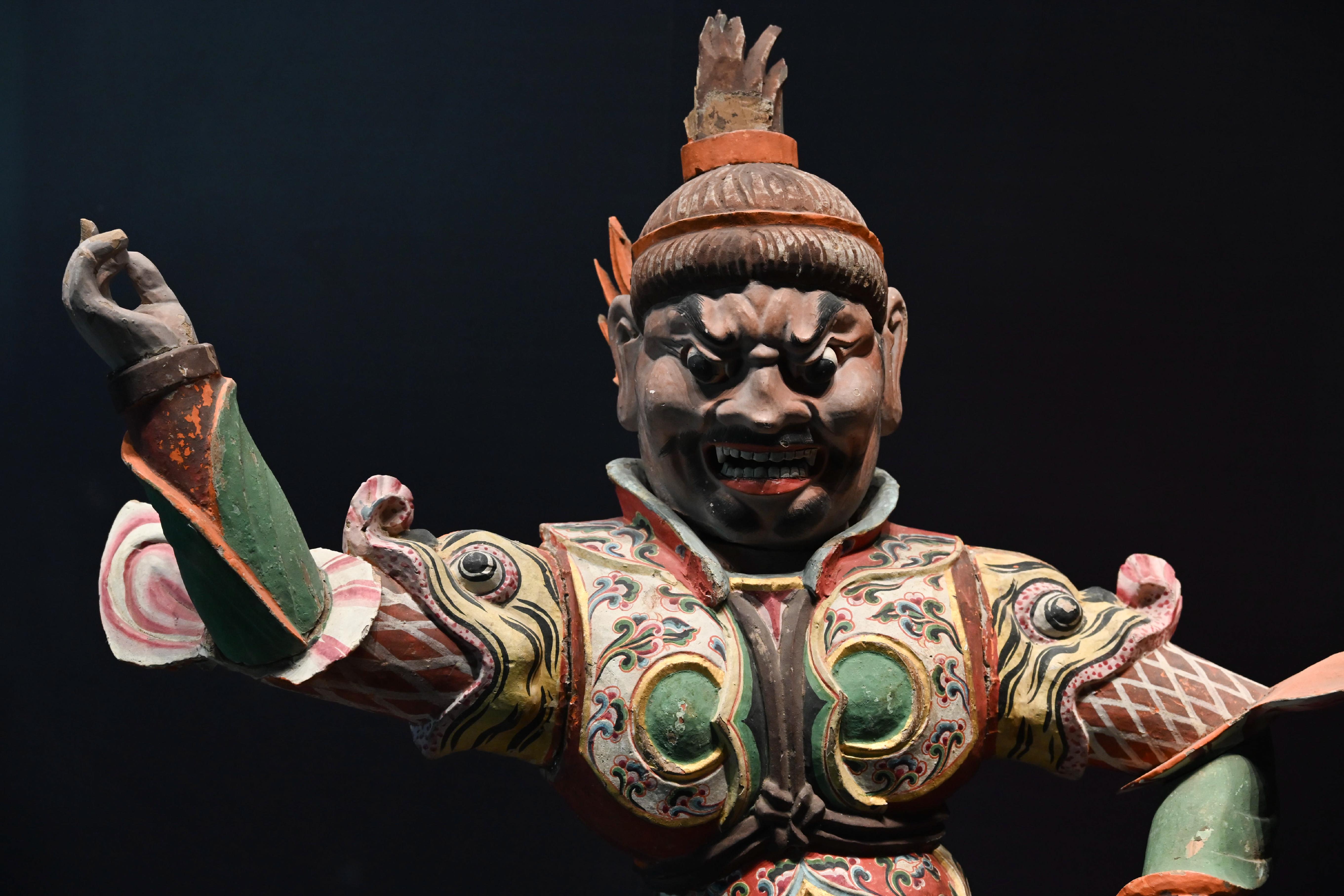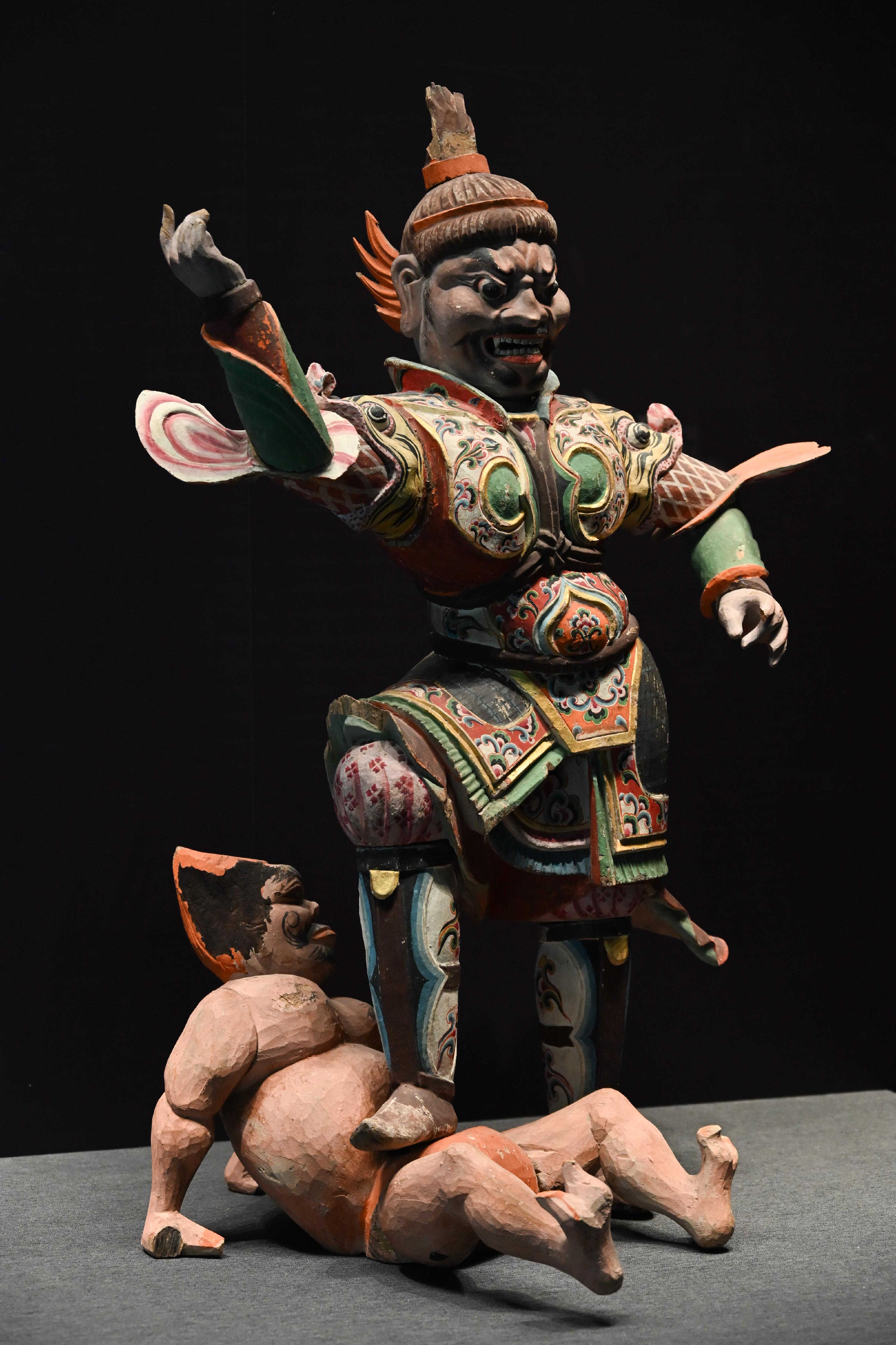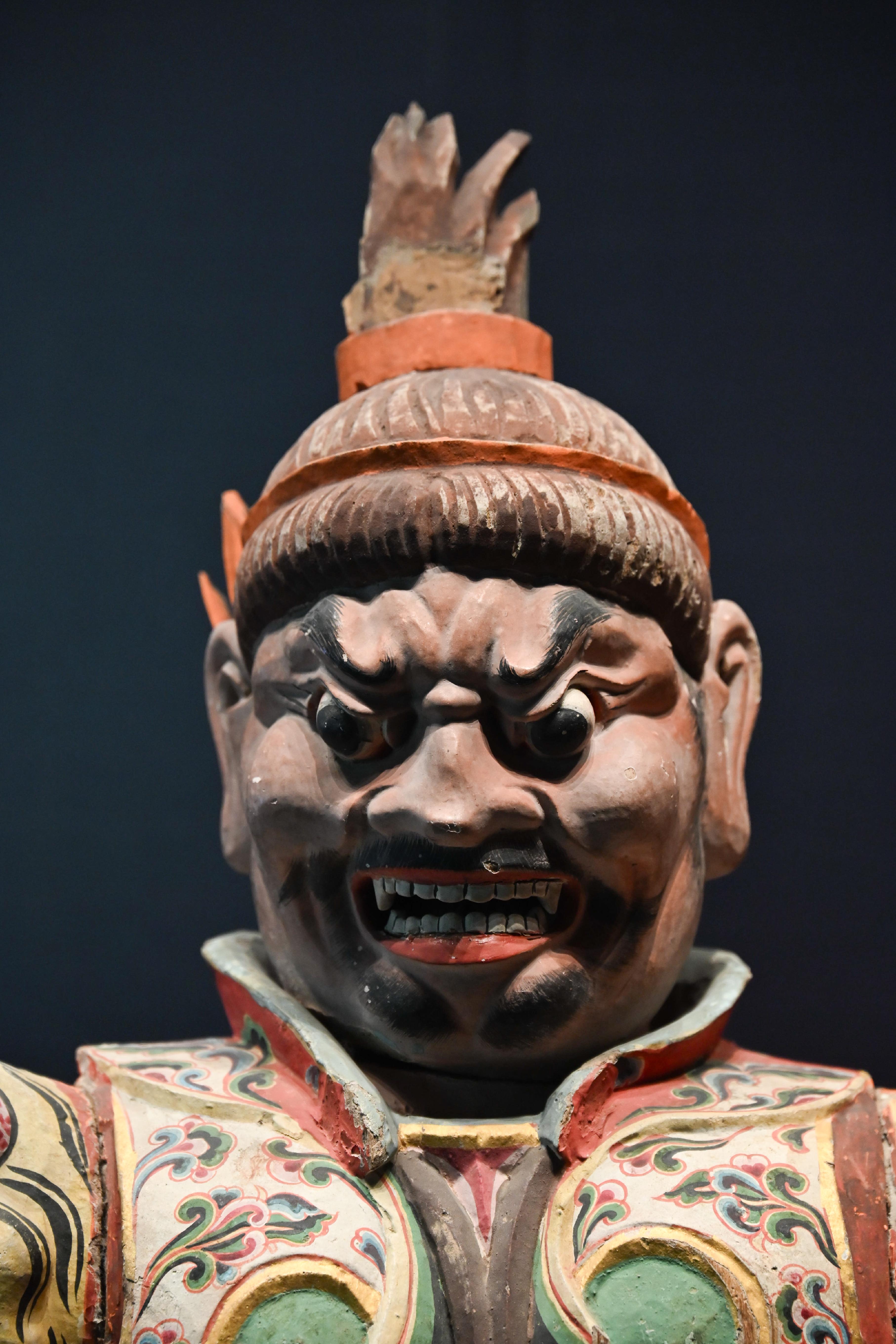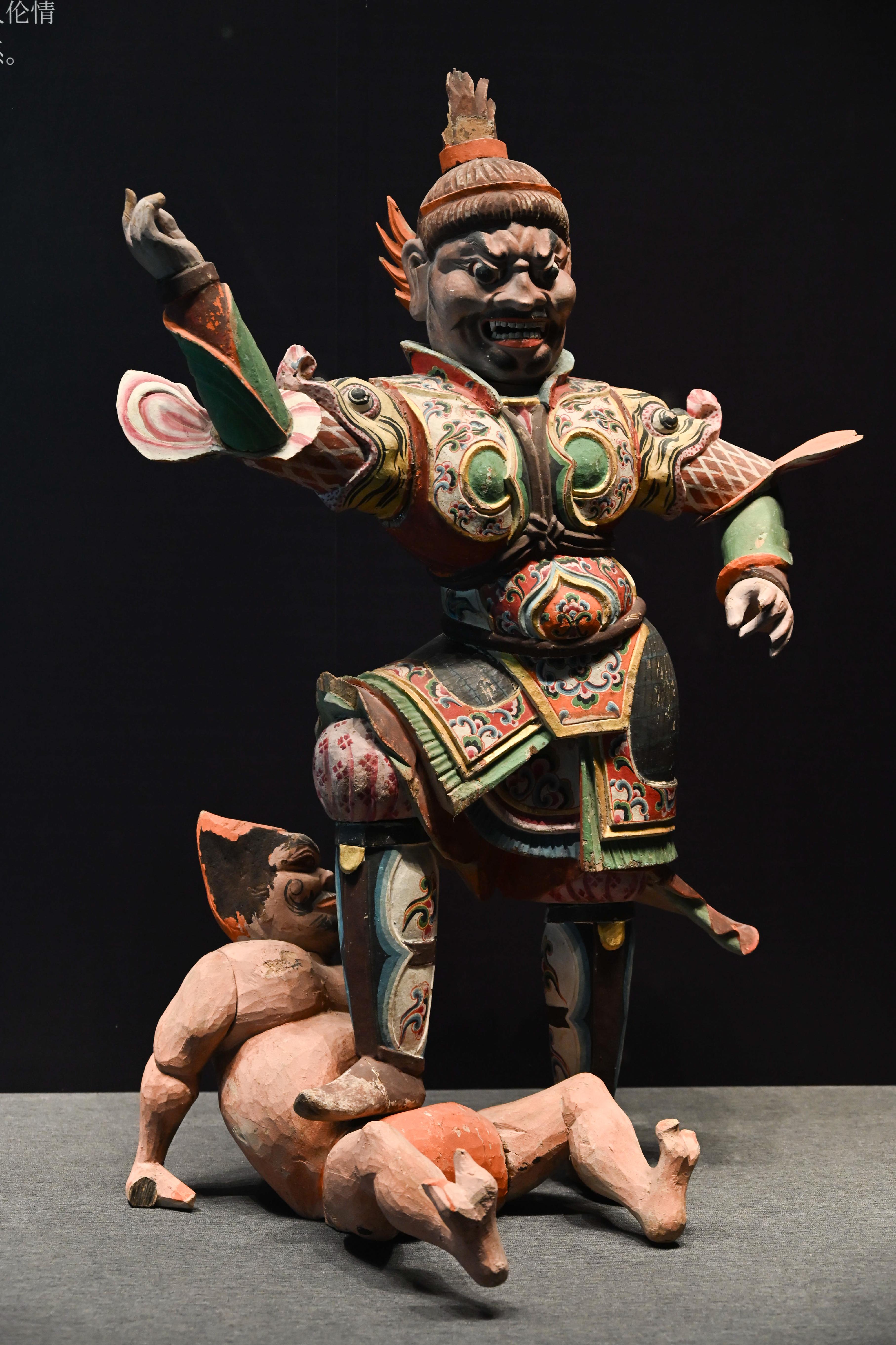 第二件展品,是唐代的彩绘天王踏鬼木俑。威风凛凛的天王一脚踏在狼狈的小鬼身上,无论是神情还是动作的刻画都非常生动传神。而且更吸引我的是天王那一身盔甲,形制繁复,颜色艳丽夺目,堪称华丽。而且这件木俑的制造难度很高,全身由头部、躯干、四肢等30余块独立构件组成,各部件通过榫卯结构连接。