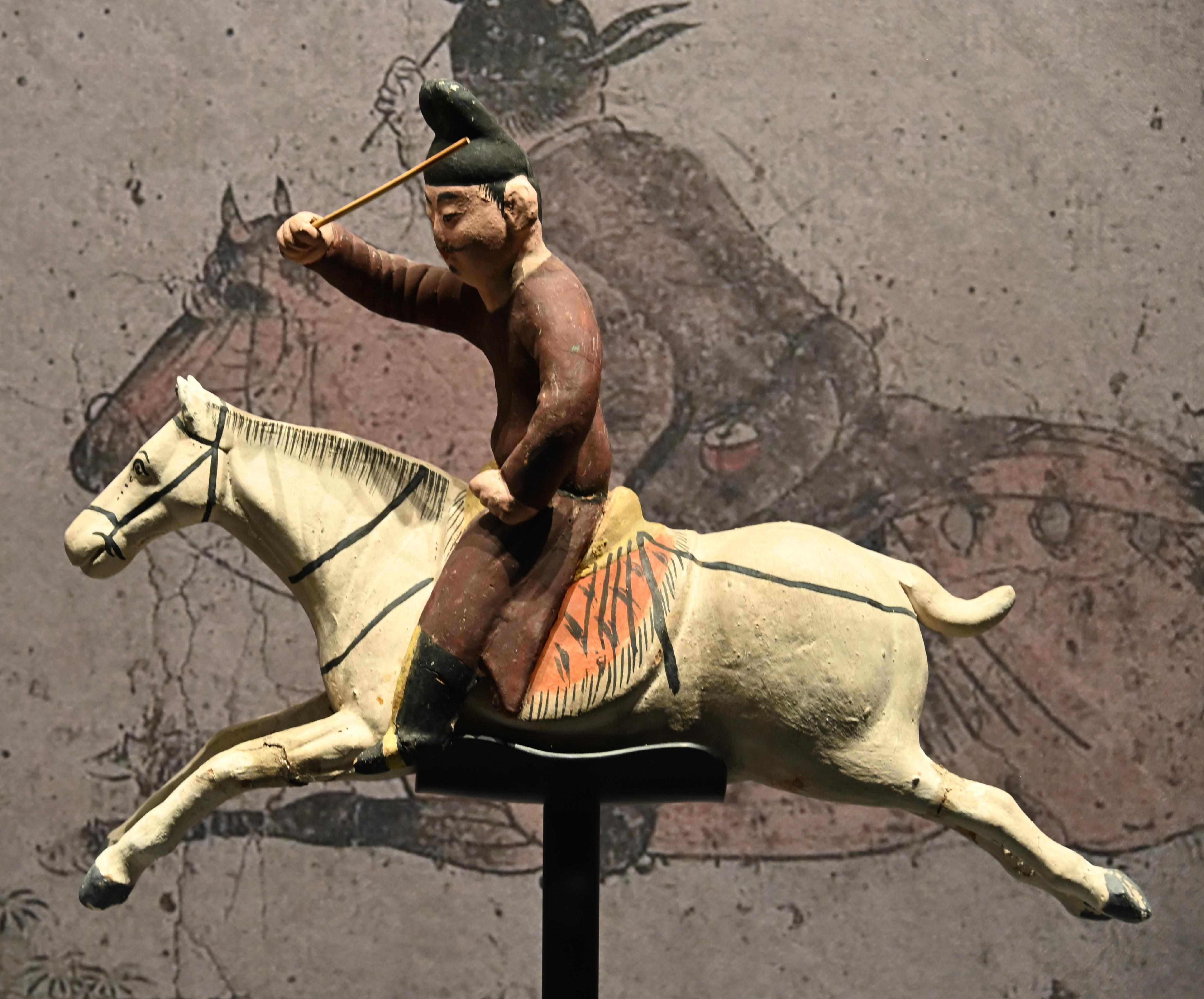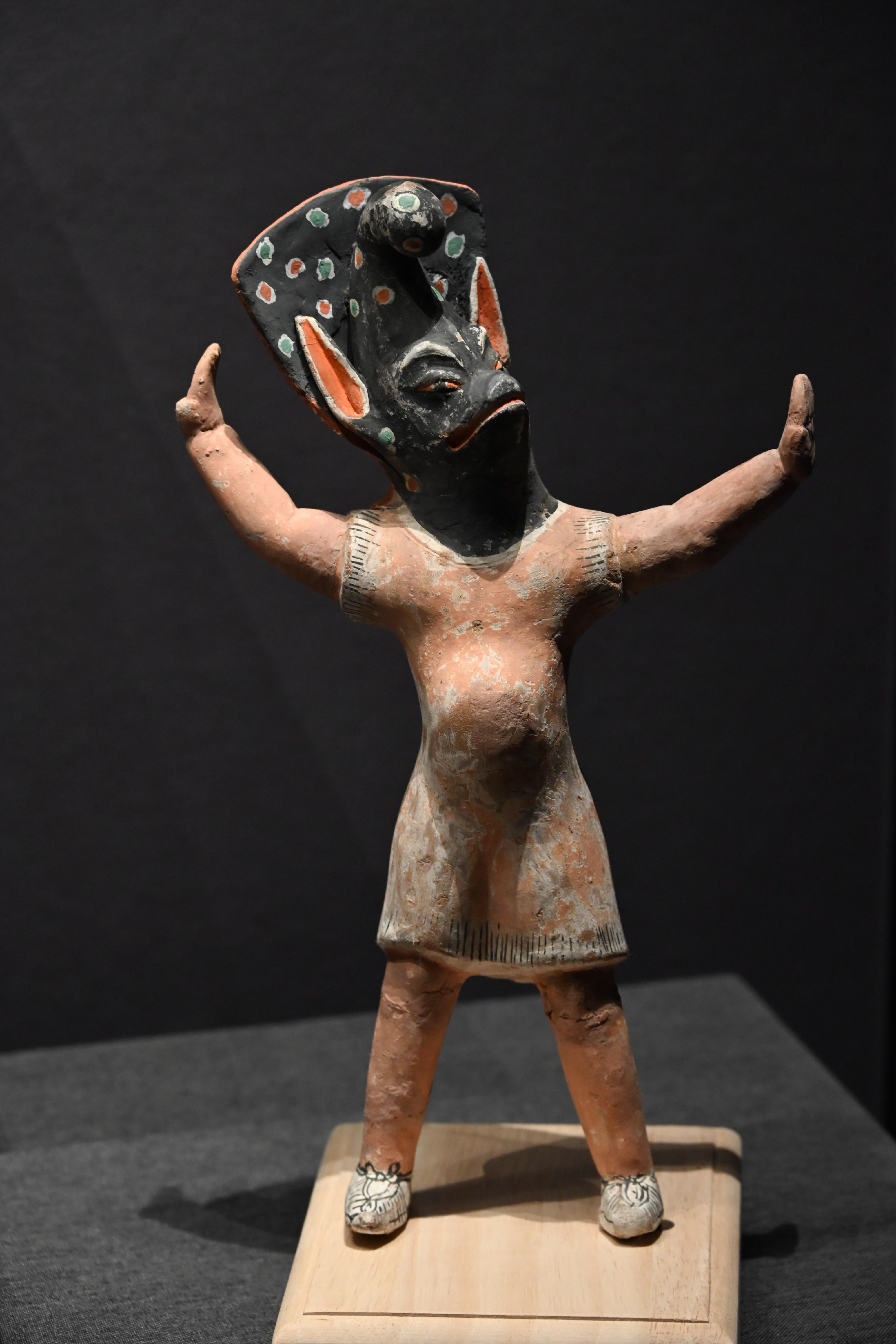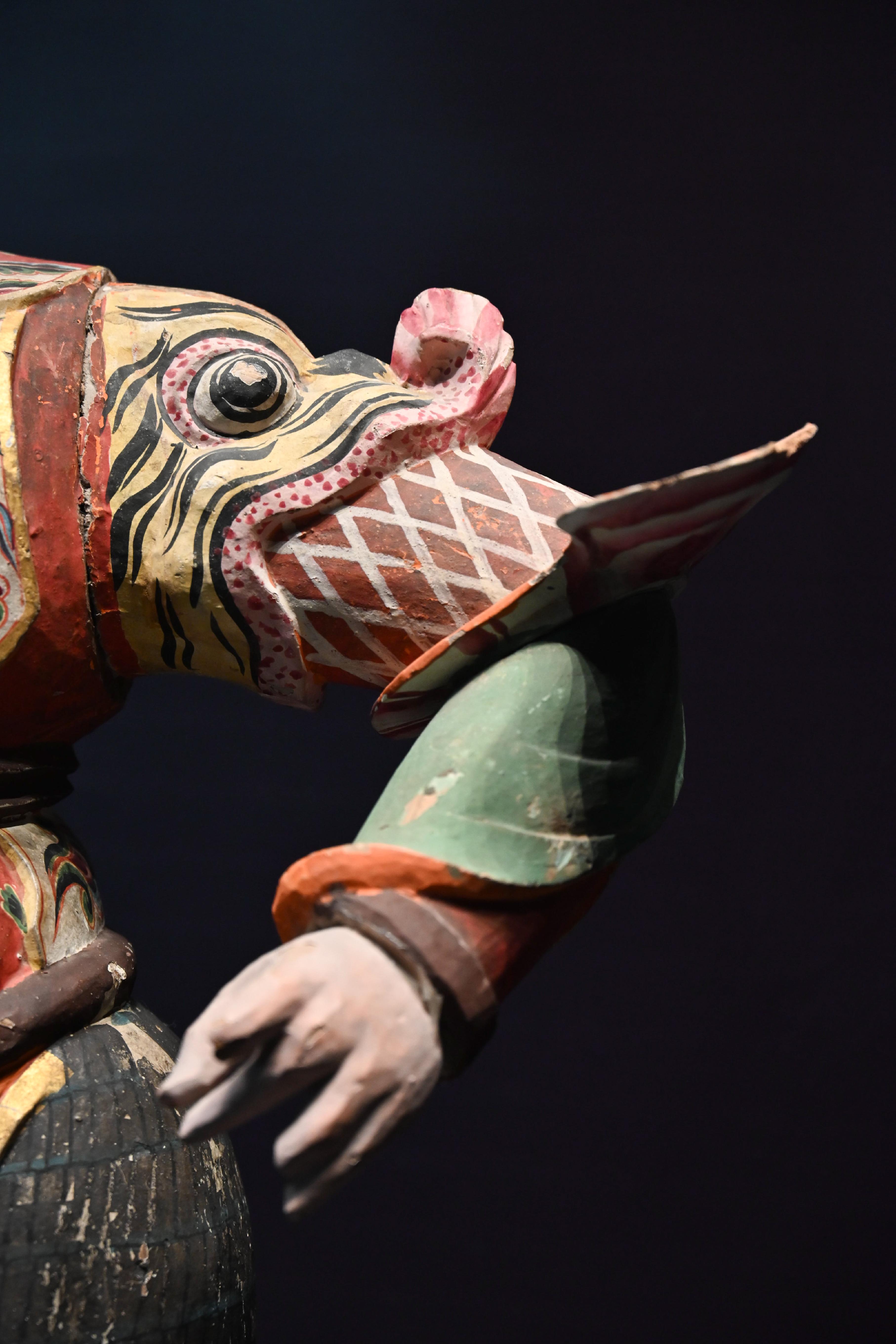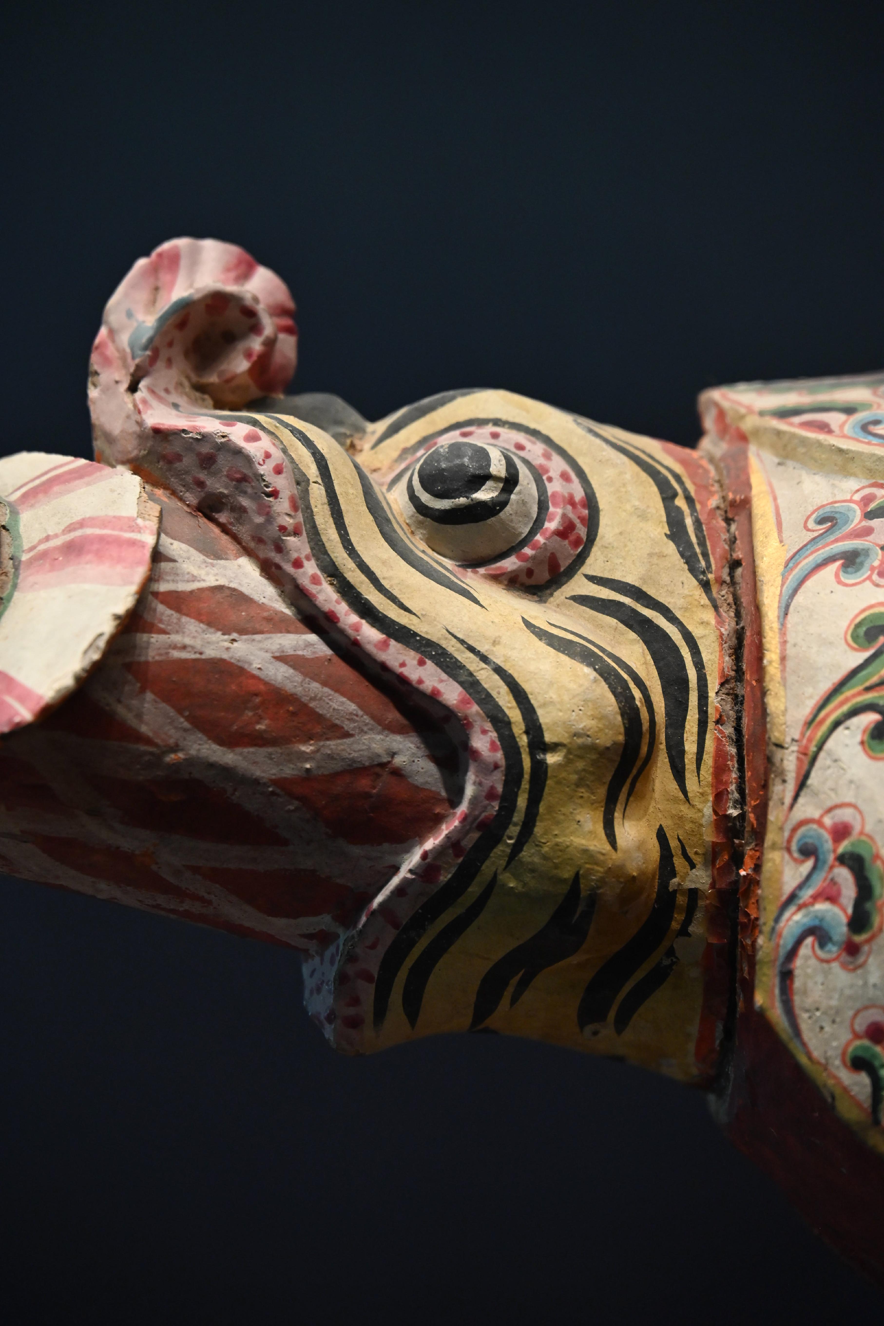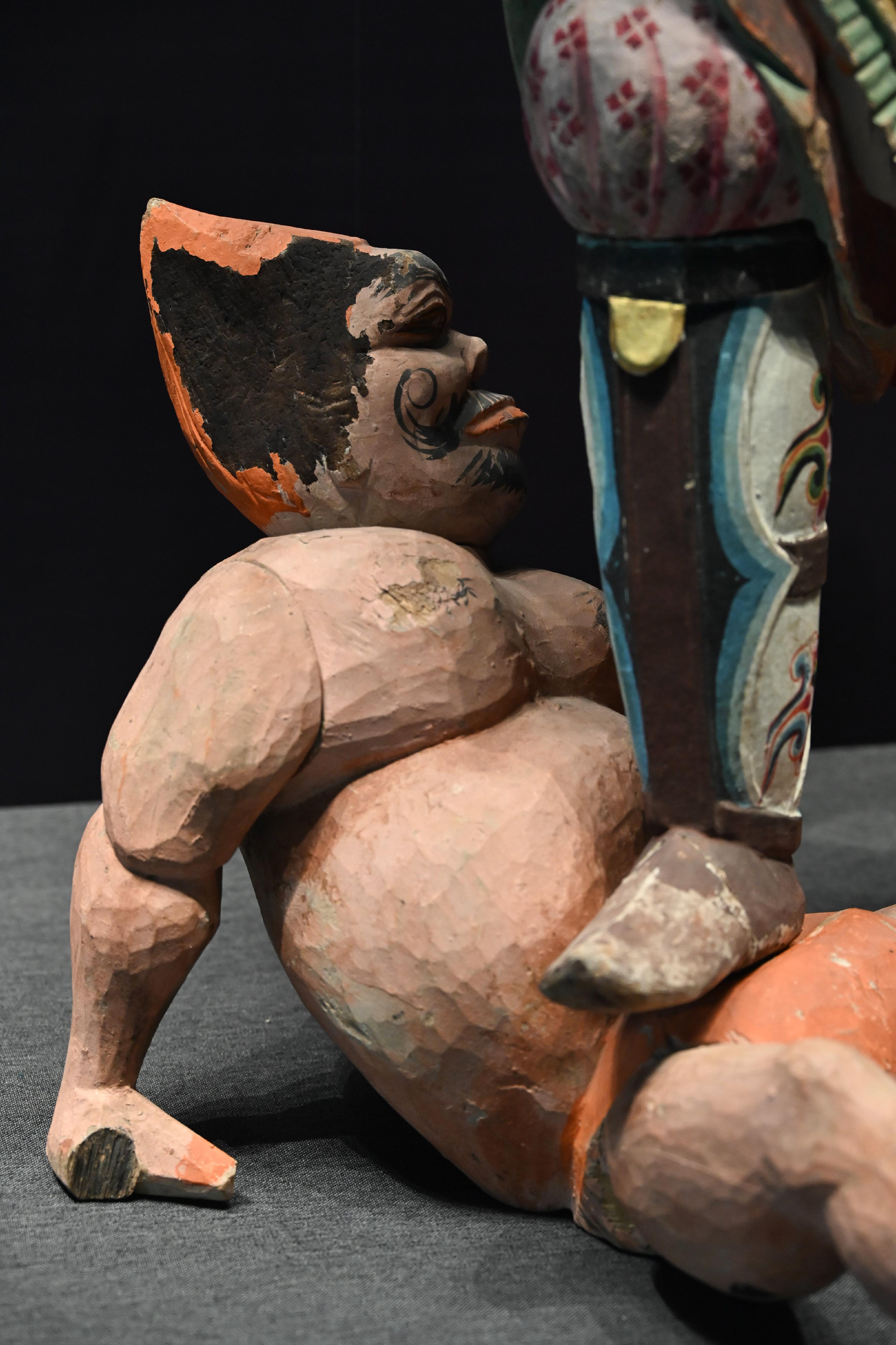 第二件展品,是唐代的彩绘天王踏鬼木俑。威风凛凛的天王一脚踏在狼狈的小鬼身上,无论是神情还是动作的刻画都非常生动传神。而且更吸引我的是天王那一身盔甲,形制繁复,颜色艳丽夺目,堪称华丽。而且这件木俑的制造难度很高,全身由头部、躯干、四肢等30余块独立构件组成,各部件通过榫卯结构连接。