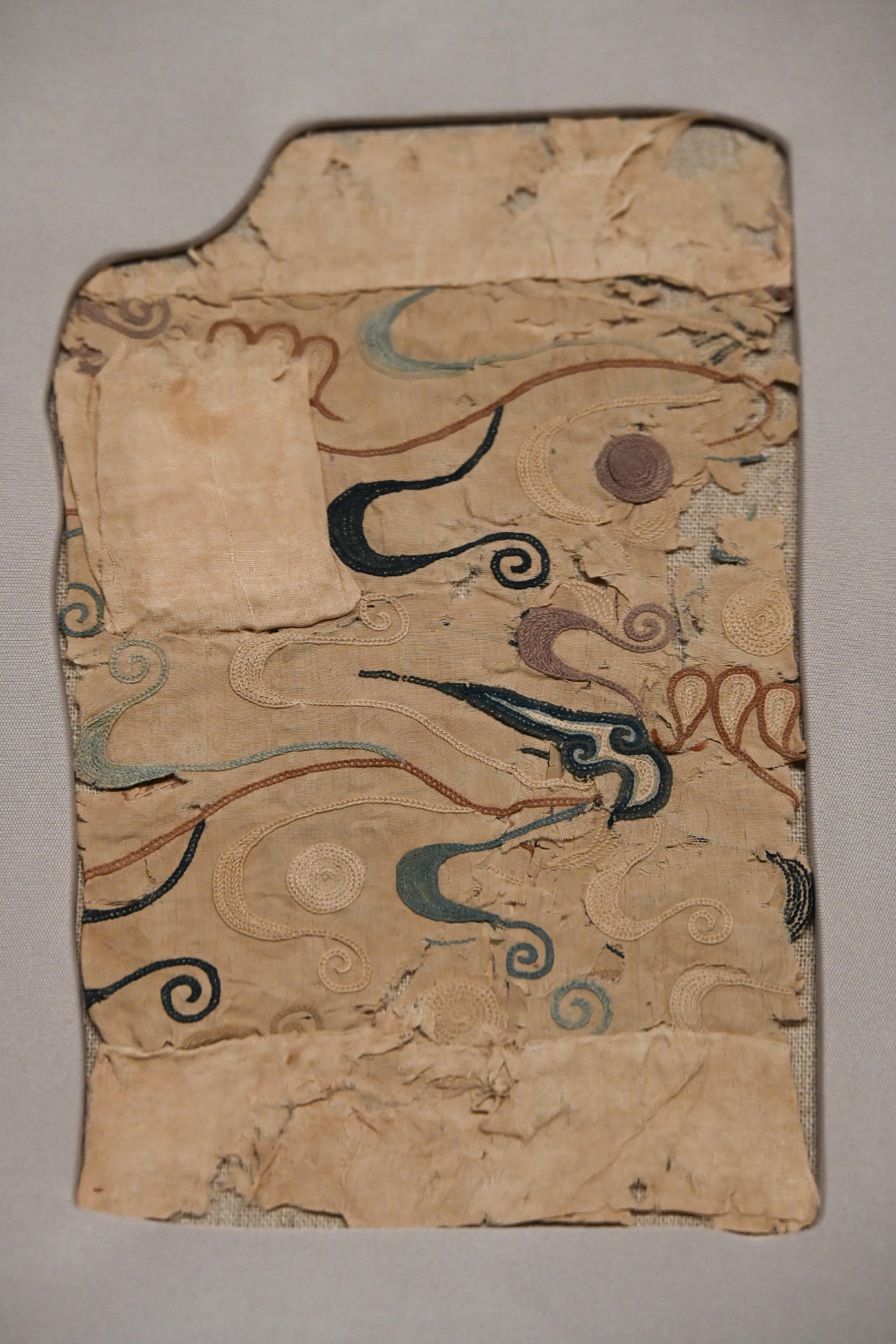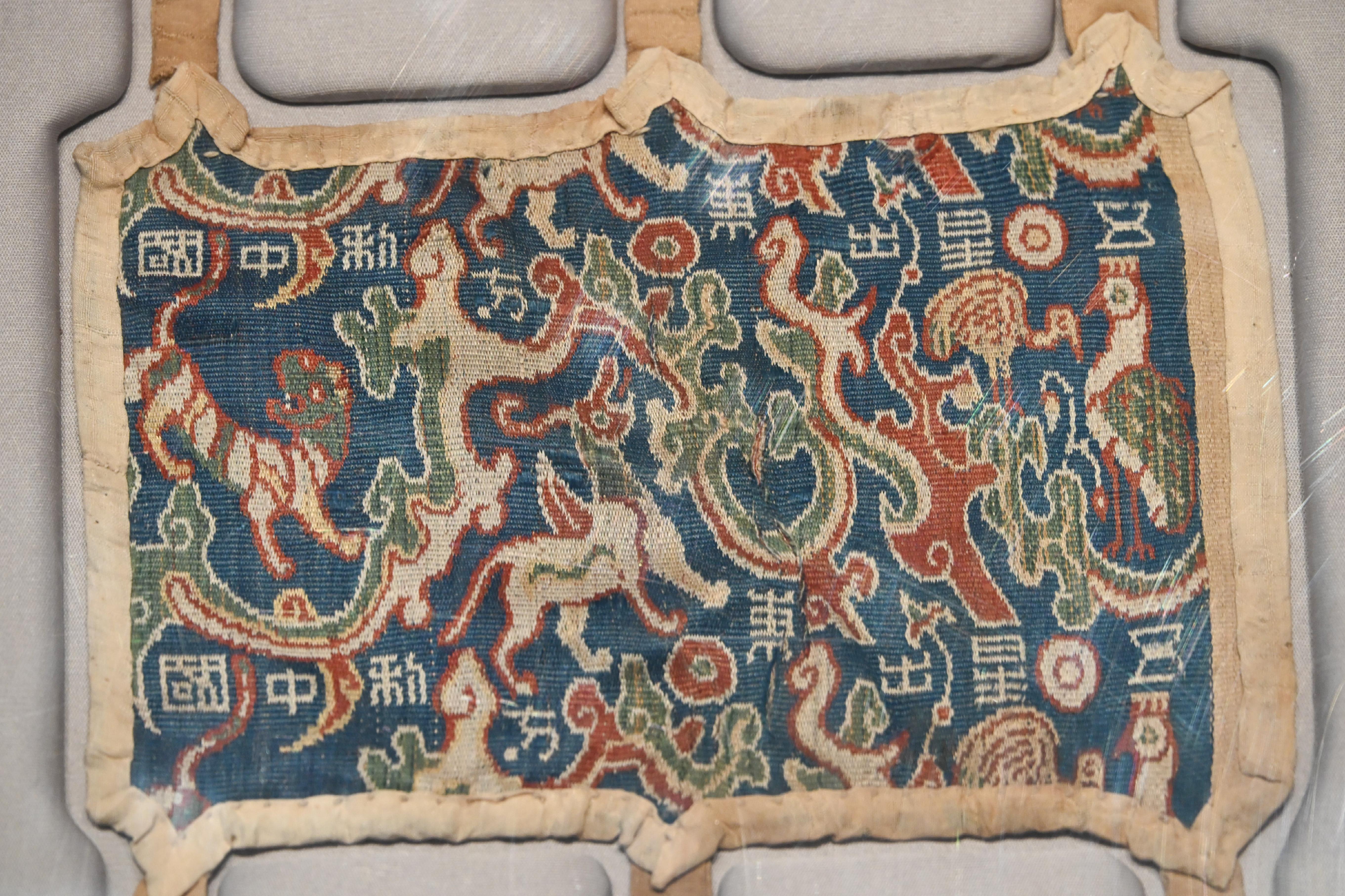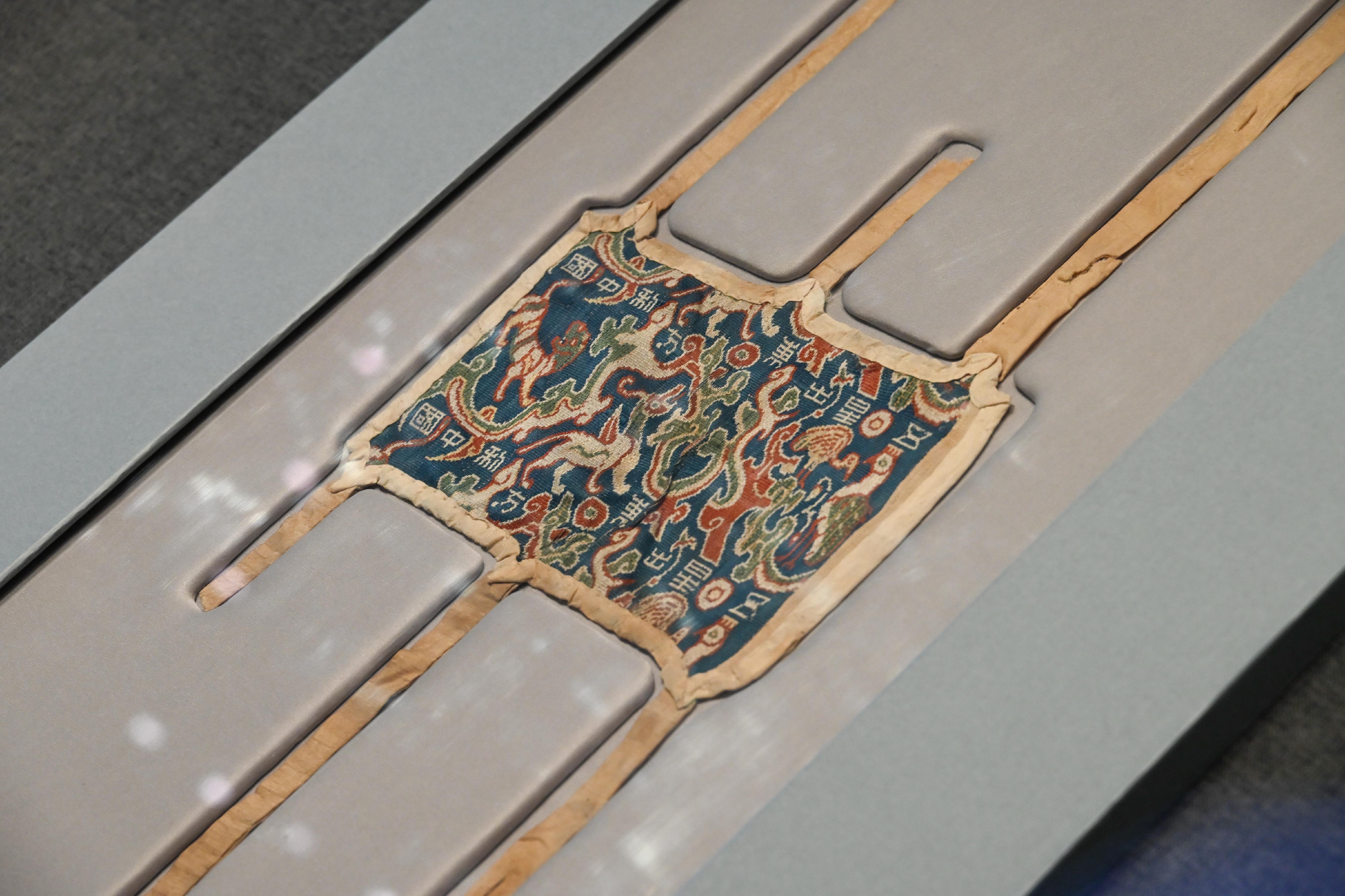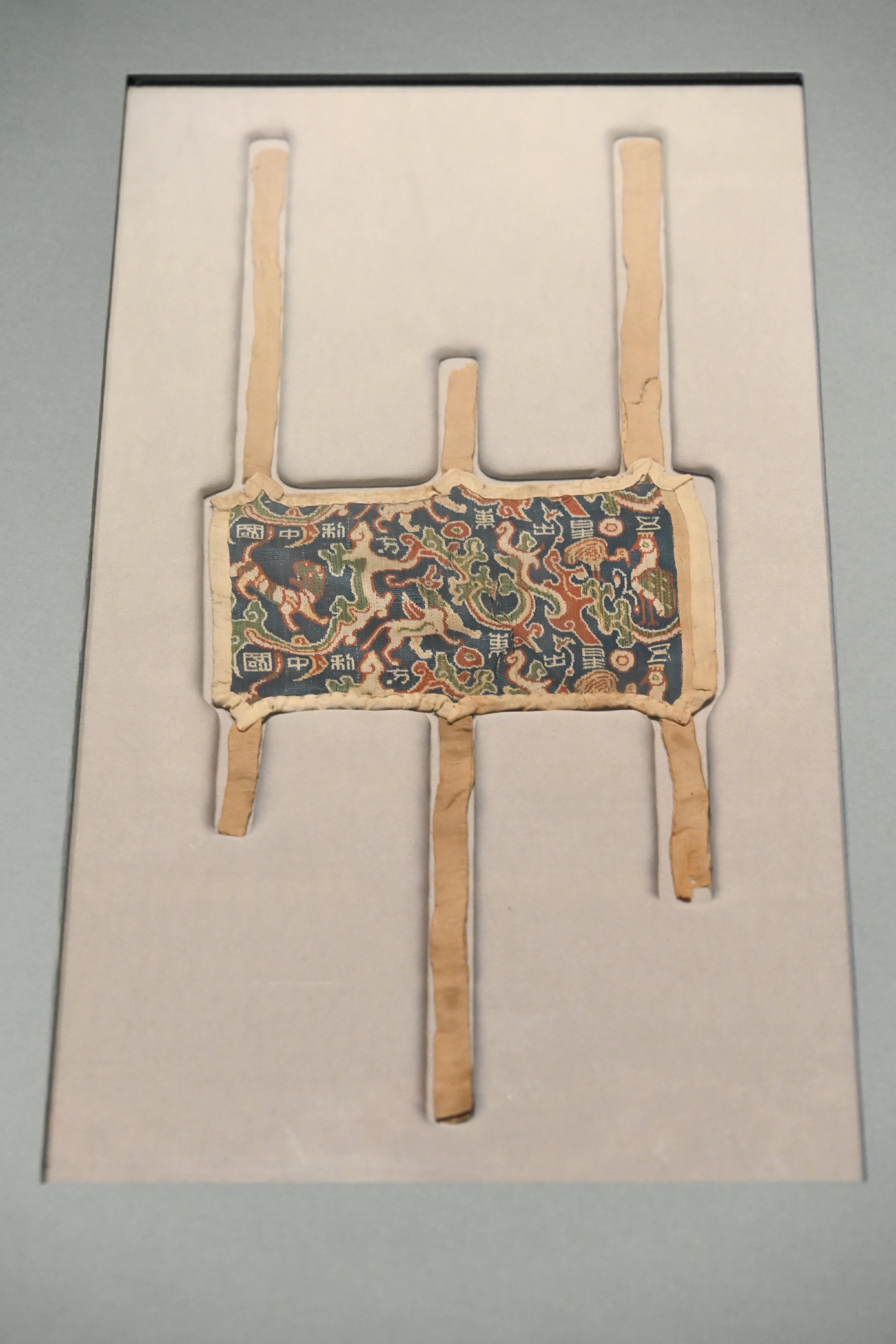 第一件展品,自然是头号镇馆之宝,东汉时期的五星出东方利中国锦护臂,以宝蓝、绛红等五色丝线织就星纹与瑞兽,“五星出东方利中国”的篆体铭文,印证着汉代中原与西域的文化关联和天文认知。它采用的青赤黄白绿五色,皆为秦汉以来发展广泛的植物染料所得。该锦的织造工艺非常复杂,为汉式织锦最高技术的代表。