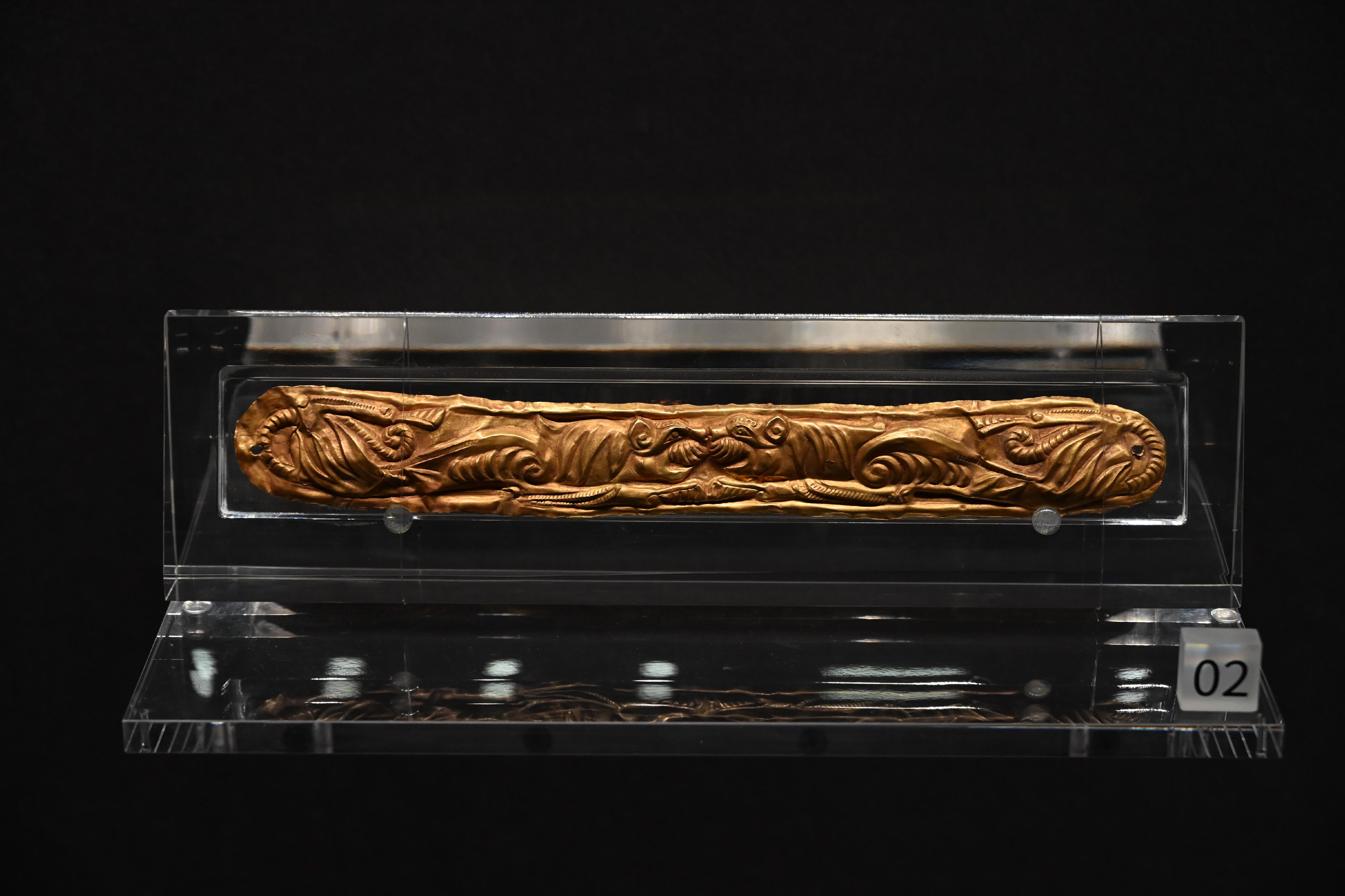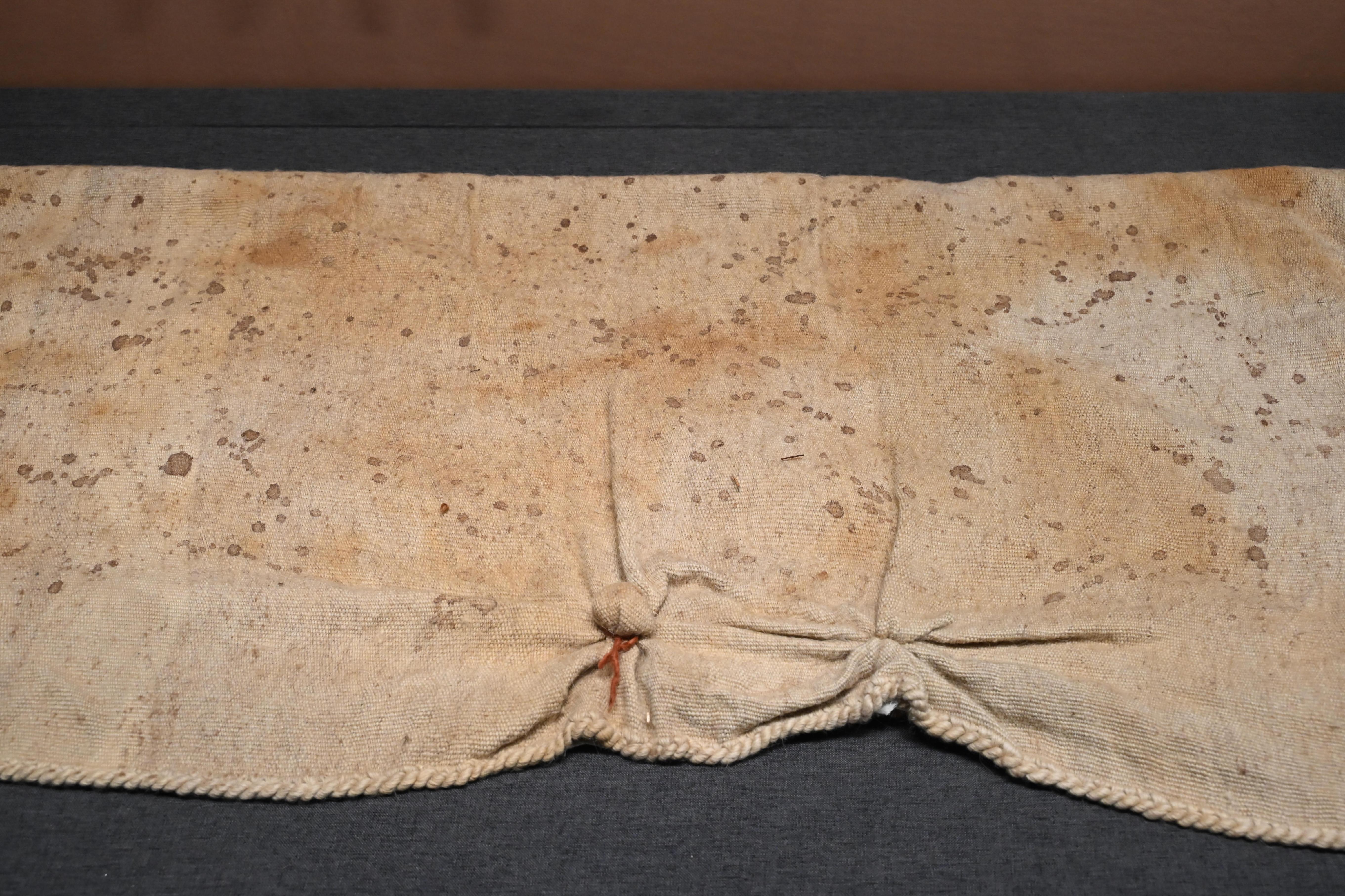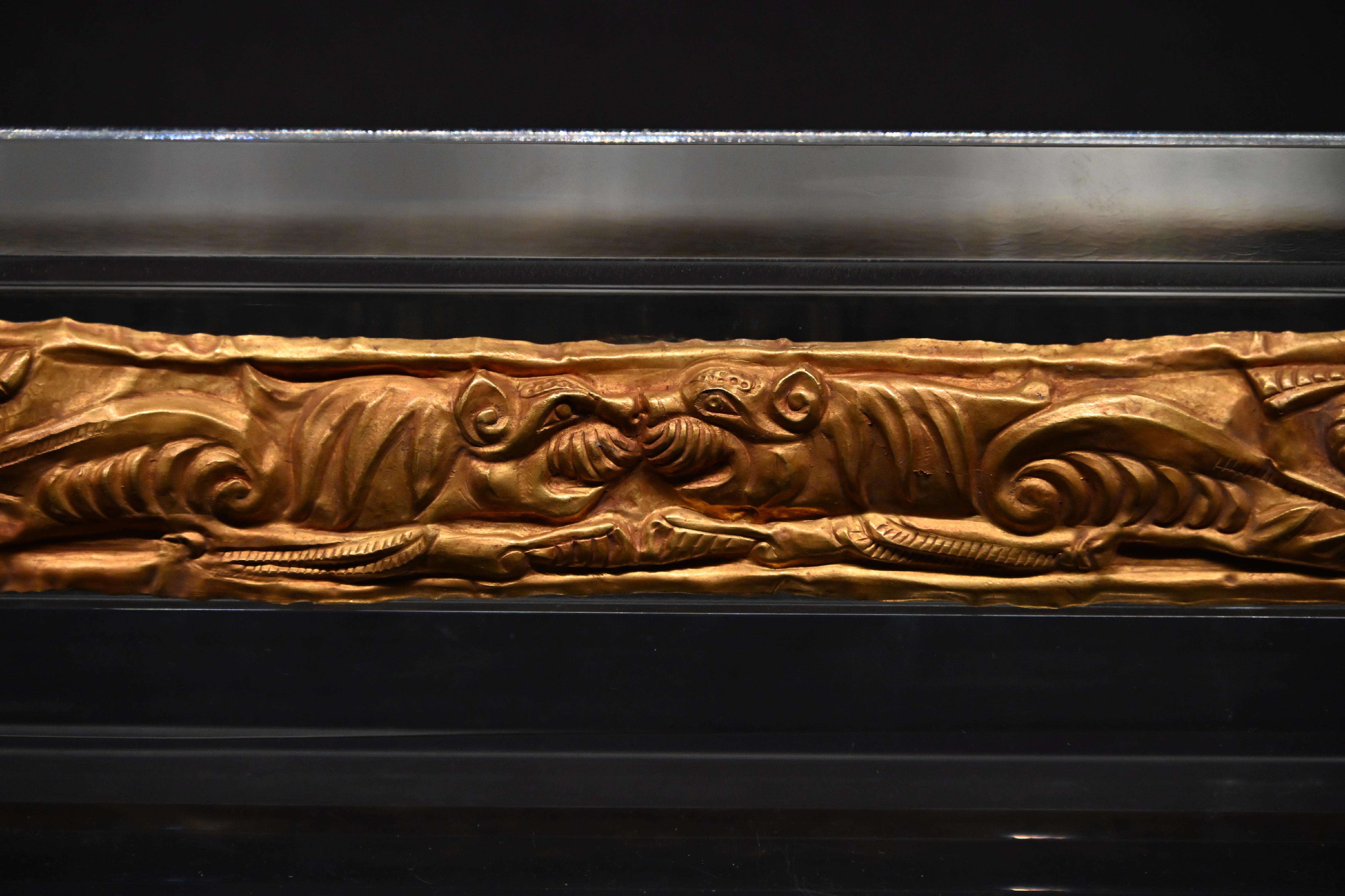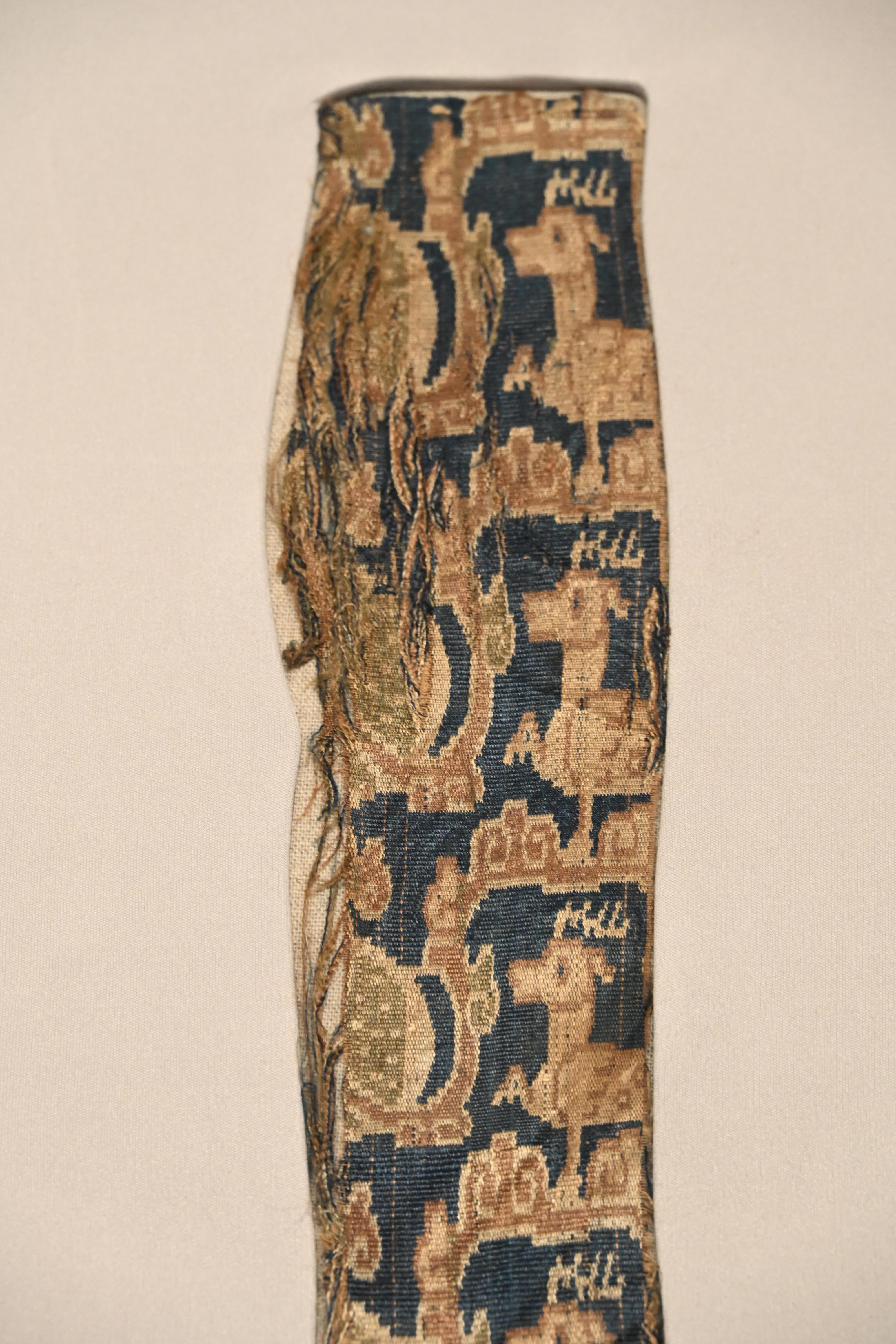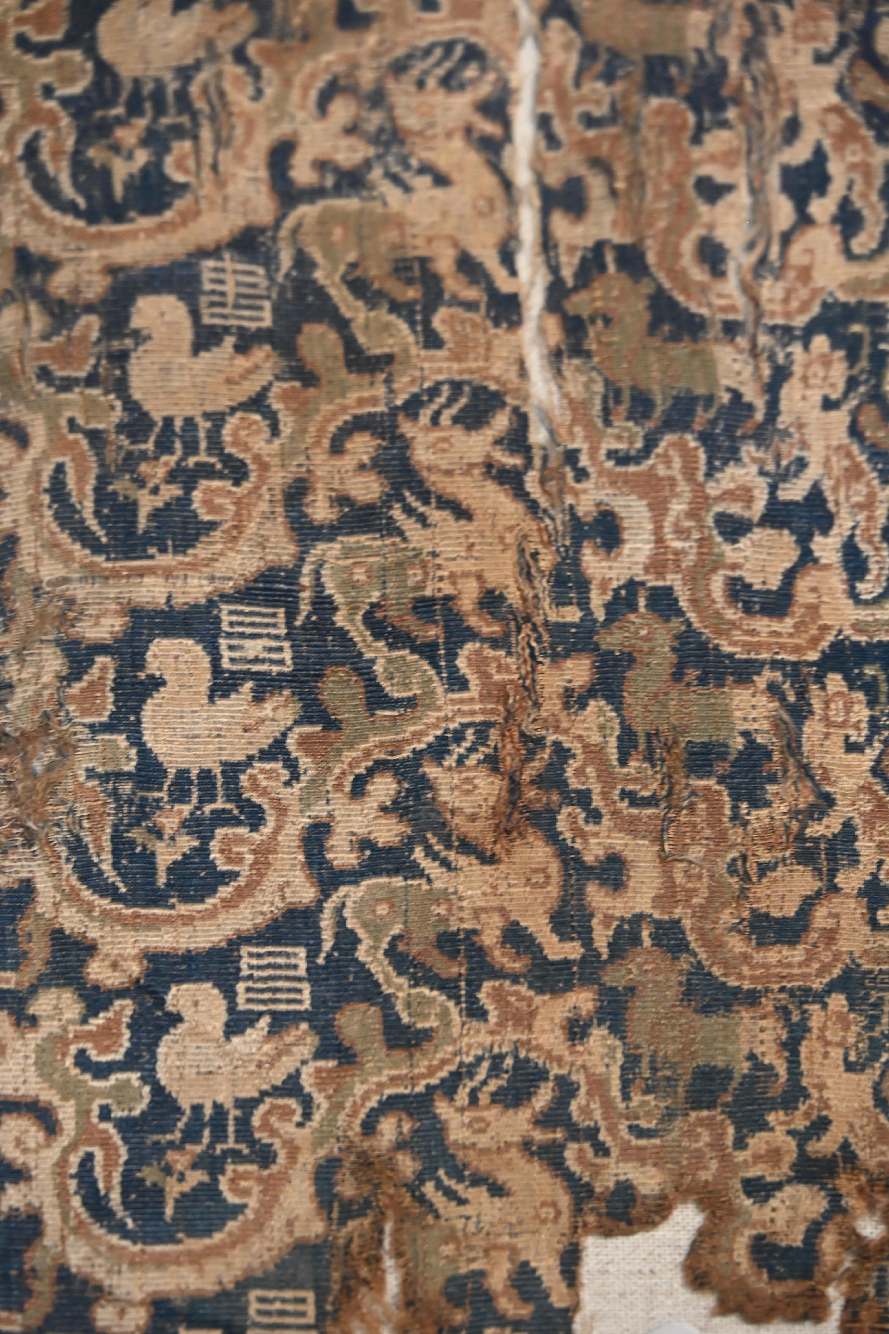 第一件展品,自然是头号镇馆之宝,东汉时期的五星出东方利中国锦护臂,以宝蓝、绛红等五色丝线织就星纹与瑞兽,“五星出东方利中国”的篆体铭文,印证着汉代中原与西域的文化关联和天文认知。它采用的青赤黄白绿五色,皆为秦汉以来发展广泛的植物染料所得。该锦的织造工艺非常复杂,为汉式织锦最高技术的代表。