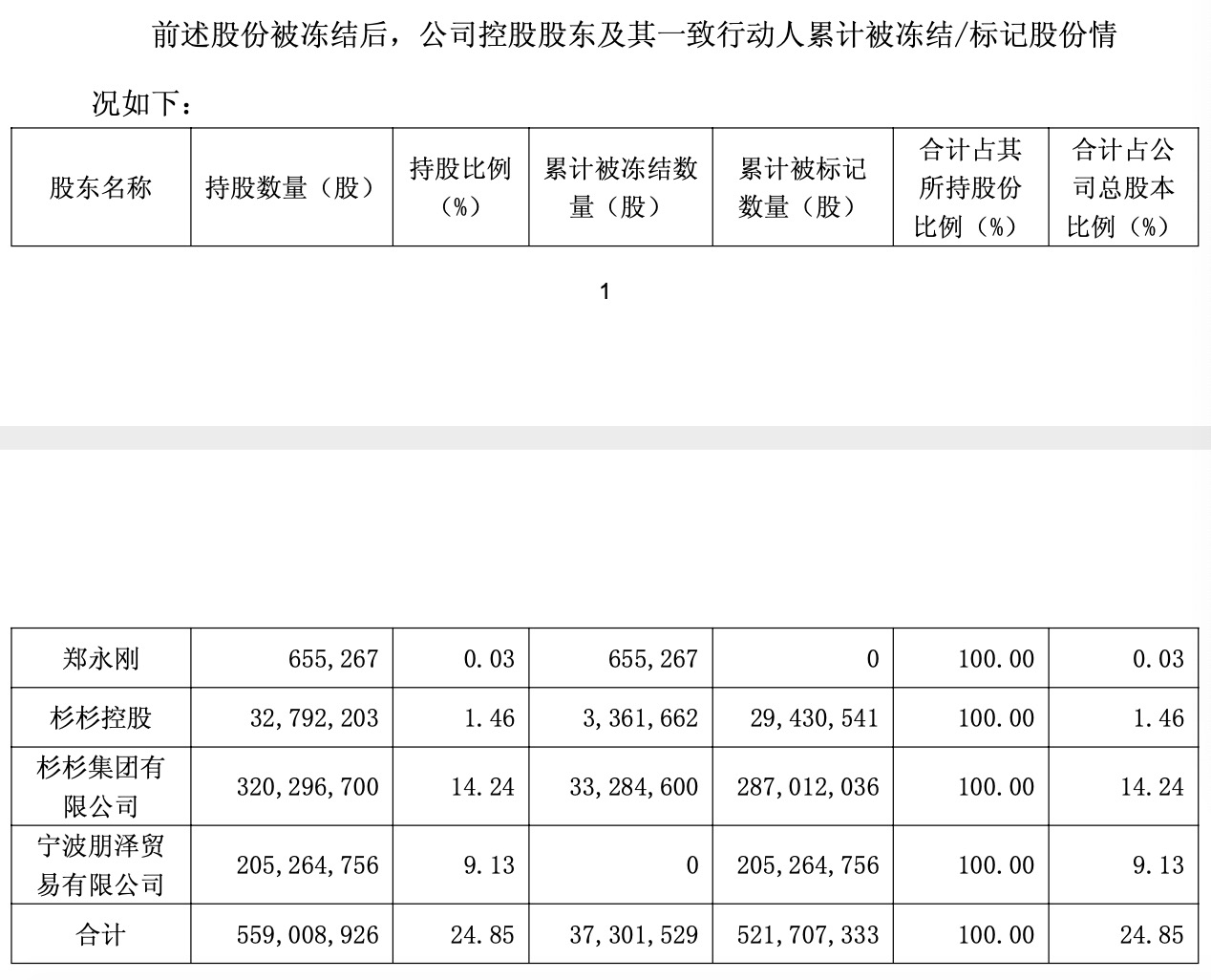 杉杉股份10月24日发布的公告现实,杉杉集团及其一致行动人合计持有杉杉股份24.85%的股权,是公司的实际控制方。然而,其持股稳定性面临严重挑战。根据公告,杉杉集团与宁波朋泽所持的约23.37%股份已几乎全部处于质押与标记状态。此外,控股股东层面还面临着数倍于其持股量的轮候冻结,反映出深度的债务困境和巨大的股权处置压力。